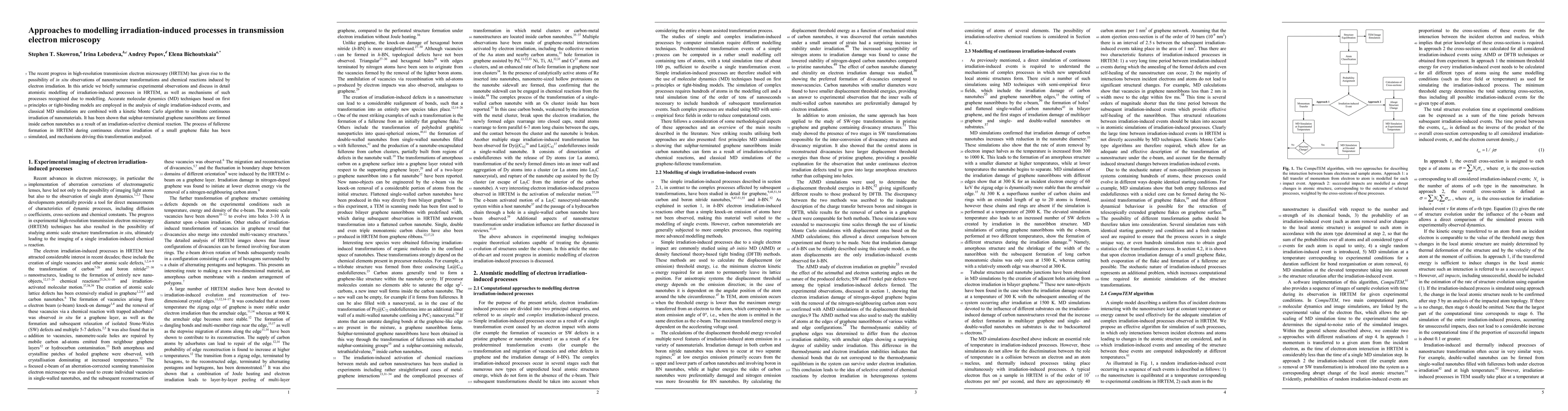This paper reviews experimental observations and atomistic modelling of irradiation-induced processes in high-resolution transmission electron microscopy (HRTEM), highlighting mechanisms such as sulphur-terminated graphene nanoribbon formation and fullerene formation in carbon nanotubes due to electron irradiation. Modelling techniques include molecular dynamics and kinetic Monte Carlo simulations.