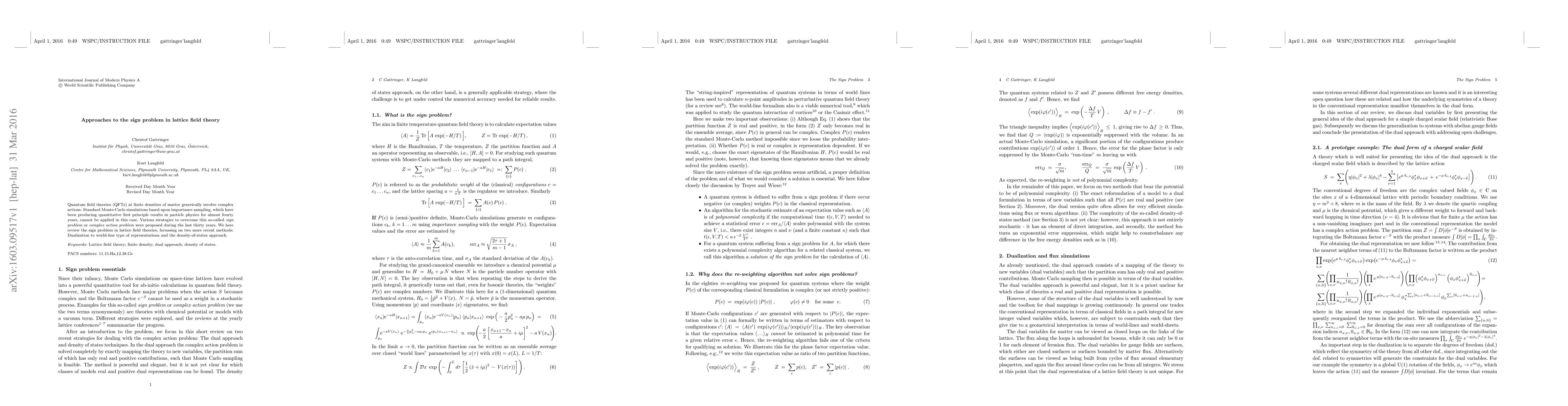 Quantum field theories (QFTs) at finite densities of matter generically involve complex actions. Standard Monte-Carlo simulations based upon importance sampling, which have been producing quantitative first principle results in particle physics for almost fourty years, cannot be applied in this case. Various strategies to overcome this so-called Sign Problem or Complex Action Problem were proposed during the last thirty years. We here review the sign problem in lattice field theories, focussing on two more recent methods: Dualization to world-line type of representations and the density-of-states approach.