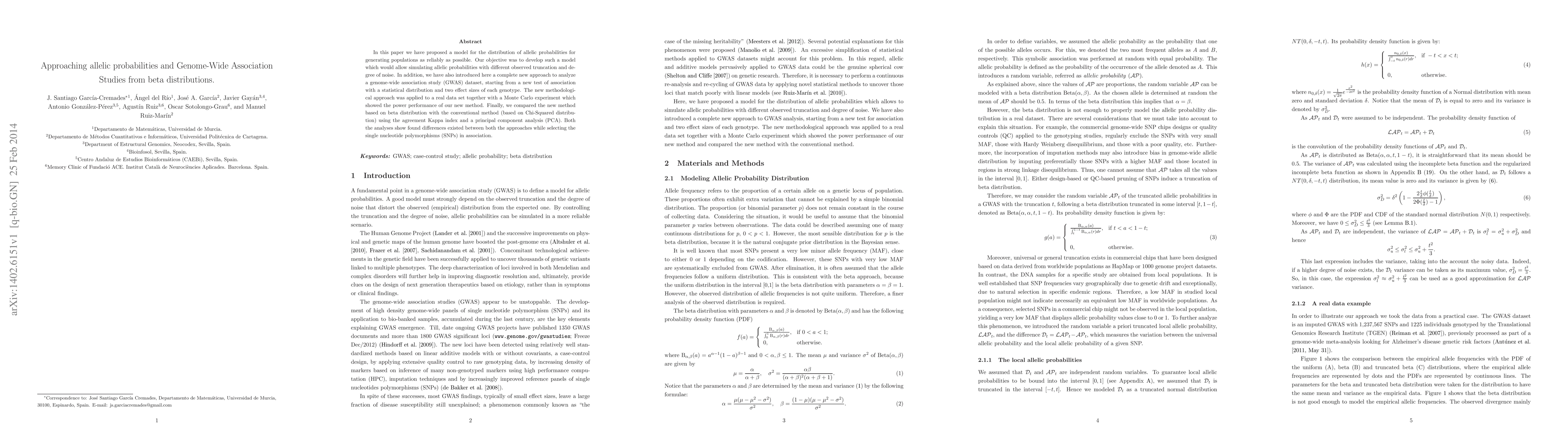 In this paper we have proposed a model for the distribution of allelic probabilities for generating populations as reliably as possible. Our objective was to develop such a model which would allow simulating allelic probabilities with different observed truncation and de- gree of noise. In addition, we have also introduced here a complete new approach to analyze a genome-wide association study (GWAS) dataset, starting from a new test of association with a statistical distribution and two effect sizes of each genotype. The new methodologi- cal approach was applied to a real data set together with a Monte Carlo experiment which showed the power performance of our new method. Finally, we compared the new method based on beta distribution with the conventional method (based on Chi-Squared distribu- tion) using the agreement Kappa index and a principal component analysis (PCA). Both the analyses show found differences existed between both the approaches while selecting the single nucleotide polymorphisms (SNPs) in association.