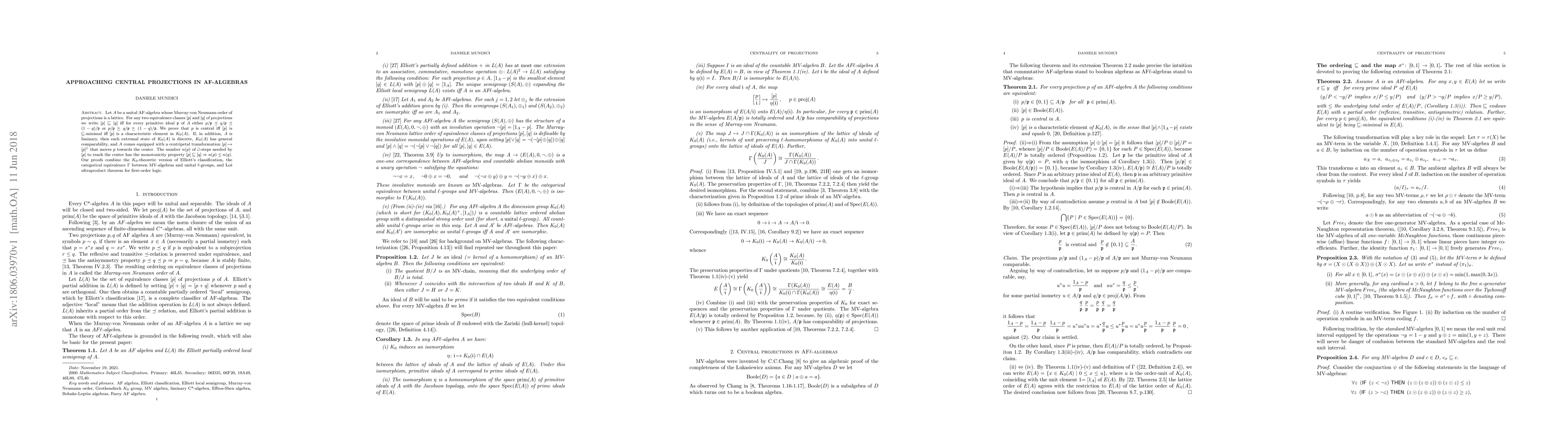 Let $A$ be a unital AF-algebra whose Murray-von Neumann order of projections is a lattice. For any two equivalence classes $[p]$ and $[q]$ of projections we write $[p]\sqsubseteq [q]$ iff for every primitive ideal $\mathfrak p$ of $A$ either $p/\mathfrak p\preceq q/\mathfrak p\preceq (1- q)/\mathfrak p$ or $p/\mathfrak p\succeq q/\mathfrak p \succeq (1-q)/\mathfrak p.$ We prove that $p$ is central iff $[p]$ is $\sqsubseteq$-minimal iff $[p]$ is a characteristic element in $K_0(A)$. If, in addition, $A$ is liminary, then each extremal state of $K_0(A)$ is discrete, $K_0(A)$ has general comparability, and $A$ comes equipped with a centripetal transformation $[p]\mapsto [p]^\Game$ that moves $p$ towards the center. The number $n(p) $ of $\Game$-steps needed by $[p]$ to reach the center has the monotonicity property $[p]\sqsubseteq [q]\Rightarrow n(p)\leq n(q).$ Our proofs combine the $K_0$-theoretic version of Elliott's classification, the categorical equivalence $\Gamma$ between MV-algebras and unital $\ell$-groups, and \L o\'s ultraproduct theorem for first-order logic.