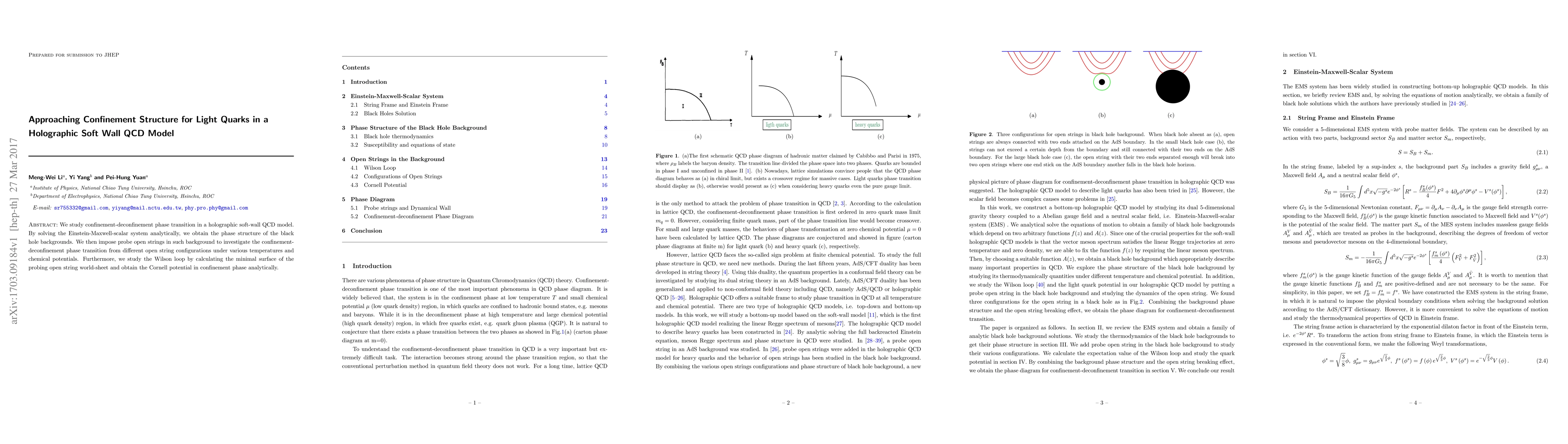 This paper investigates the confinement-deconfinement phase transition in a holographic soft-wall QCD model, solving the Einstein-Maxwell-scalar system to analyze black hole backgrounds. It employs probe open strings to study phase transitions under varying temperatures and chemical potentials, and derives the Cornell potential analytically from the minimal surface of the open string world-sheet.