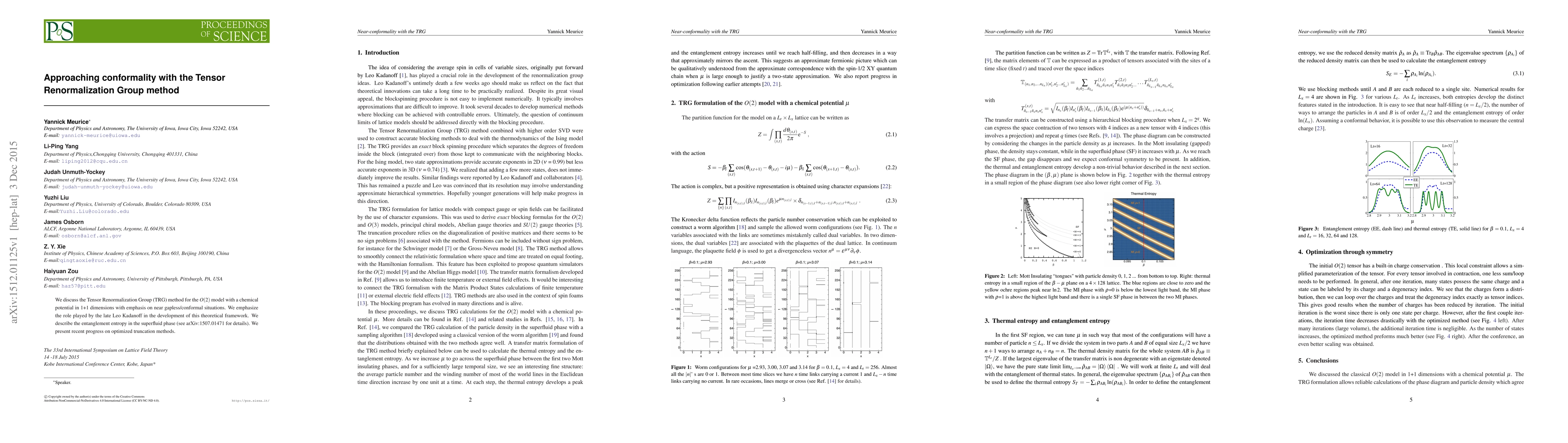 Researchers used the Tensor Renormalization Group method to study the O(2) model in 1+1 dimensions, focusing on near-gapless/conformal situations and recent progress on optimized truncation methods. The study emphasizes the importance of late Leo Kadanoff in developing this theoretical framework.