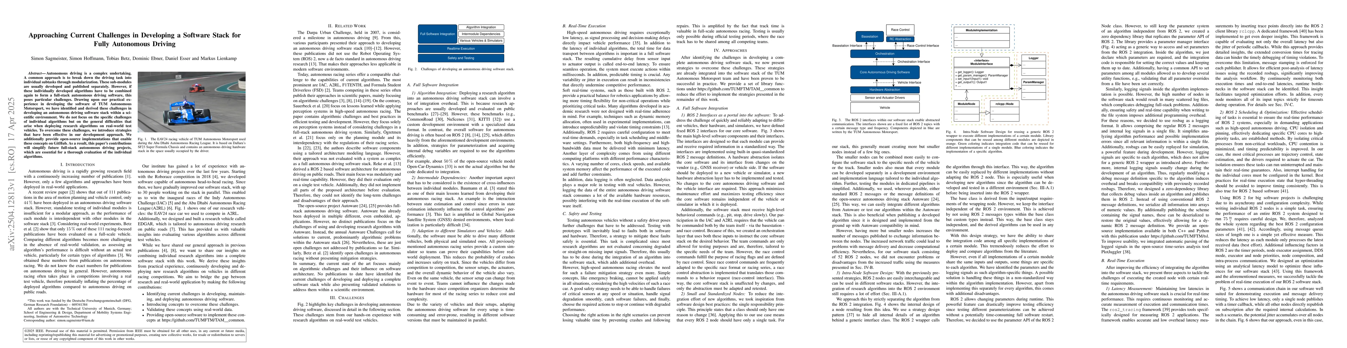 This work distinguishes itself by focusing on the general challenges of deploying research algorithms in a full-stack autonomous driving software rather than individual algorithm complexities, providing practical strategies and open-source solutions.