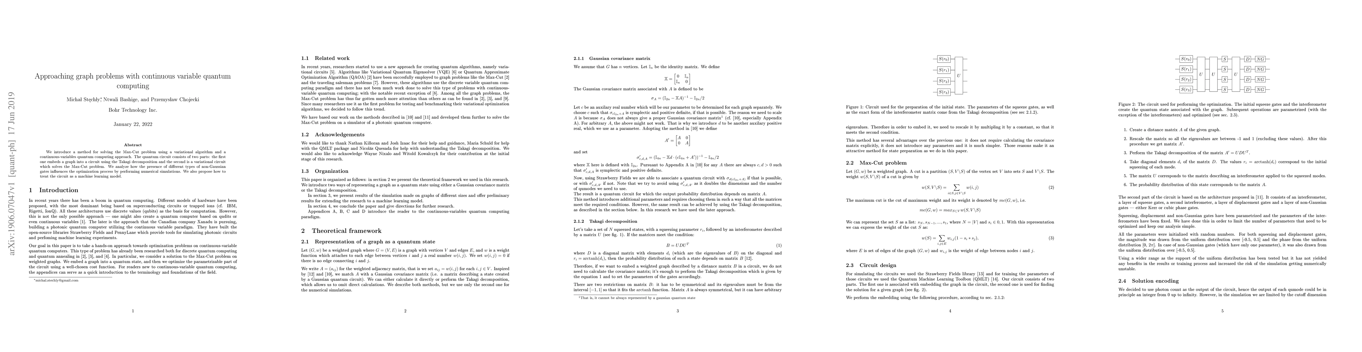 We introduce a method for solving the Max-Cut problem using a variational algorithm and a continuous-variables quantum computing approach. The quantum circuit consists of two parts: the first one embeds a graph into a circuit using the Takagi decomposition and the second is a variational circuit which solves the Max-Cut problem. We analyze how the presence of different types of non-Gaussian gates influences the optimization process by performing numerical simulations. We also propose how to treat the circuit as a machine learning model.