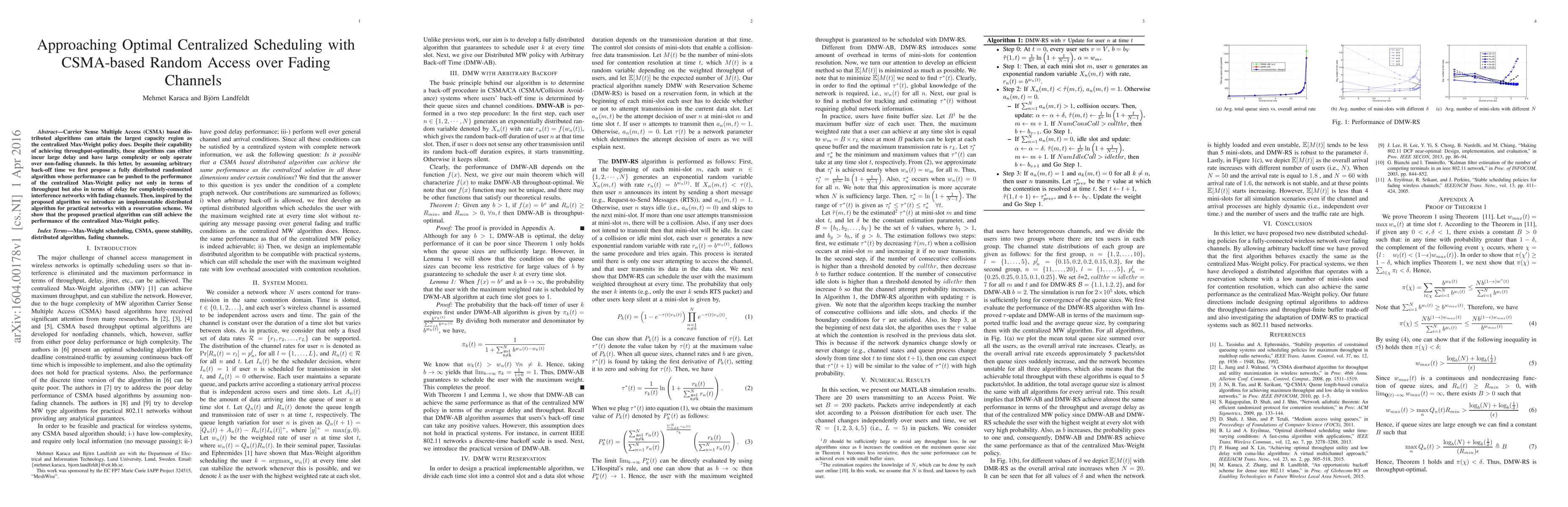 This paper proposes a fully distributed randomized CSMA algorithm that achieves optimal throughput and delay performance comparable to centralized Max-Weight scheduling in fully-connected interference networks with fading channels. It also introduces a practical distributed algorithm with a reservation scheme for real-world networks, maintaining performance close to the centralized approach.