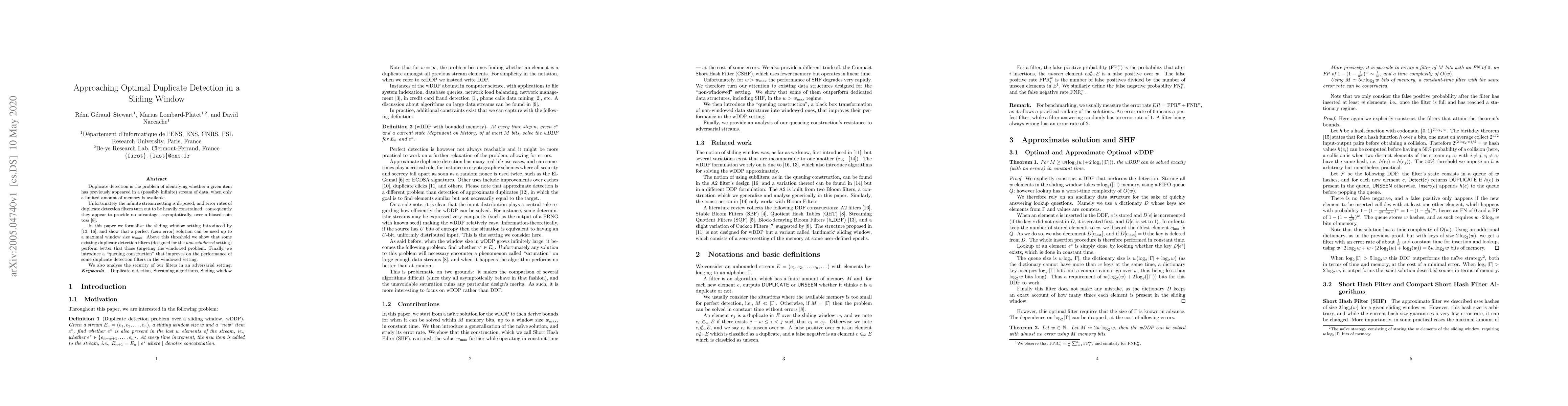 This paper explores optimal duplicate detection in a sliding window model, demonstrating that a perfect solution is feasible up to a maximal window size. It compares existing filters, showing that some perform better in the windowed setting despite being designed for non-windowed scenarios, and introduces a new "queuing construction" that enhances performance. The paper also examines the security of these filters against adversarial attacks.