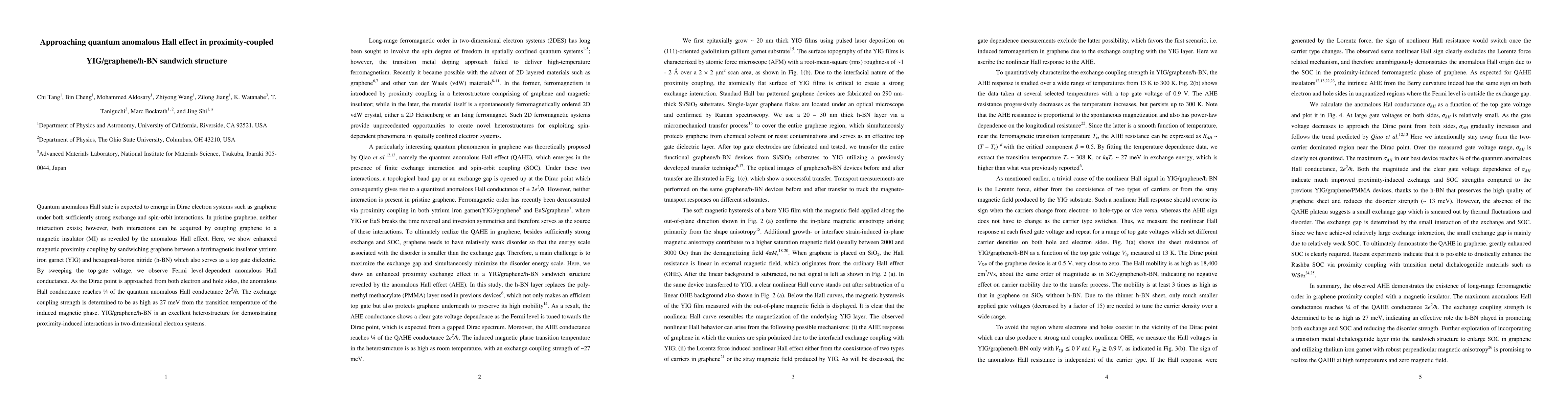 This study investigates the quantum anomalous Hall effect in a YIG/graphene/h-BN heterostructure, demonstrating strong magnetic proximity coupling that induces spin-orbit and exchange interactions in graphene, approaching 1/4 of the quantum anomalous Hall conductance and revealing an exchange coupling strength of 27 meV.