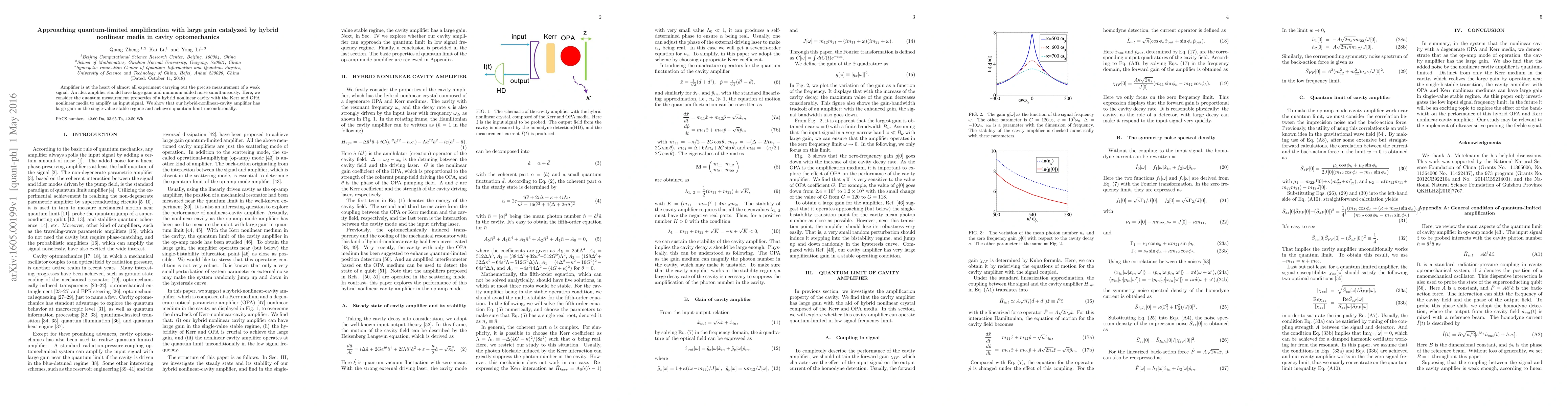 Amplifier is at the heart of almost all experiment carrying out the precise measurement of a weak signal. An idea amplifier should have large gain and minimum added noise simultaneously. Here, we consider the quantum measurement properties of a hybrid nonlinear cavity with the Kerr and OPA nonlinear media to amplify an input signal. We show that our hybrid-nonlinear-cavity amplifier has large gain in the single-value stable regime and achieves quantum limit unconditionally.