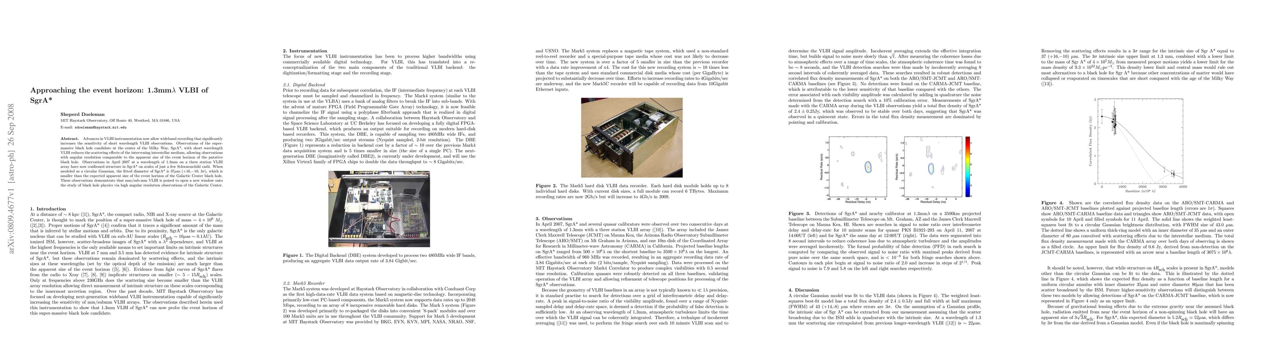 Advances in VLBI instrumentation now allow wideband recording that significantly increases the sensitivity of short wavelength VLBI observations. Observations of the super-massive black hole candidate at the center of the Milky Way, SgrA*, with short wavelength VLBI reduces the scattering effects of the intervening interstellar medium, allowing observations with angular resolution comparable to the apparent size of the event horizon of the putative black hole. Observations in April 2007 at a wavelength of 1.3mm on a three station VLBI array have now confirmed structure in SgrA* on scales of just a few Schwarzschild radii. When modeled as a circular Gaussian, the fitted diameter of SgrA* is 37 micro arcsec (+16,-10; 3-sigma), which is smaller than the expected apparent size of the event horizon of the Galactic Center black hole. These observations demonstrate that mm/sub-mm VLBI is poised to open a new window onto the study of black hole physics via high angular resolution observations of the Galactic Center.
