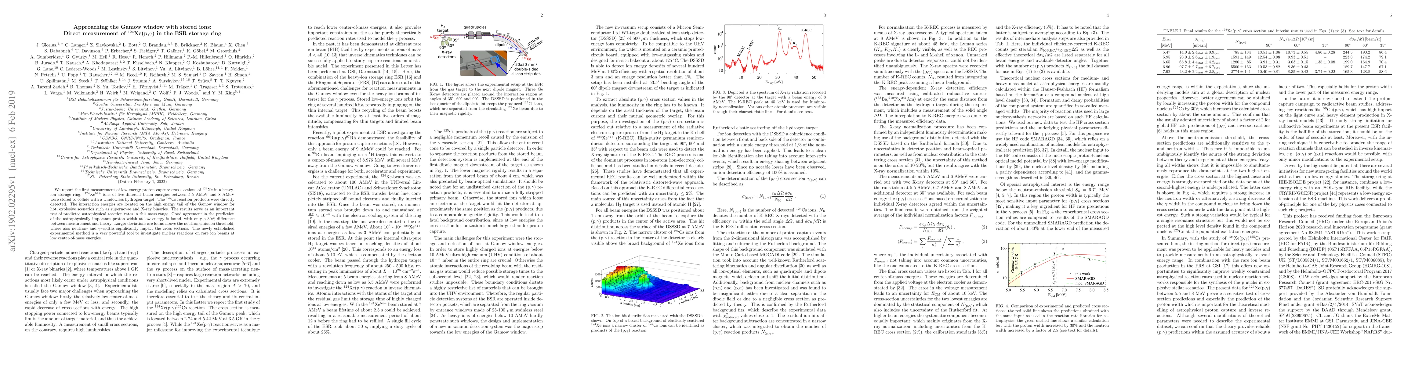 We report the first measurement of low-energy proton-capture cross sections of $^{124}$Xe in a heavy ion storage ring. $^{124}$Xe$^{54+}$ ions of five different beam energies between 5.5 AMeV and 8 AMeV were stored to collide with a windowless hydrogen target. The $^{125}$Cs reaction products were directly detected. The interaction energies are located on the high energy tail of the Gamow window for hot, explosive scenarios such as supernovae and X-ray binaries. The results serve as an important test of predicted astrophysical reaction rates in this mass range. Good agreement in the prediction of the astrophysically important proton width at low energy is found, with only a 30% difference between measurement and theory. Larger deviations are found above the neutron emission threshold, where also neutron- and ${\gamma}$-widths significantly impact the cross sections. The newly established experimental method is a very powerful tool to investigate nuclear reactions on rare ion beams at low center-of-mass energies.
