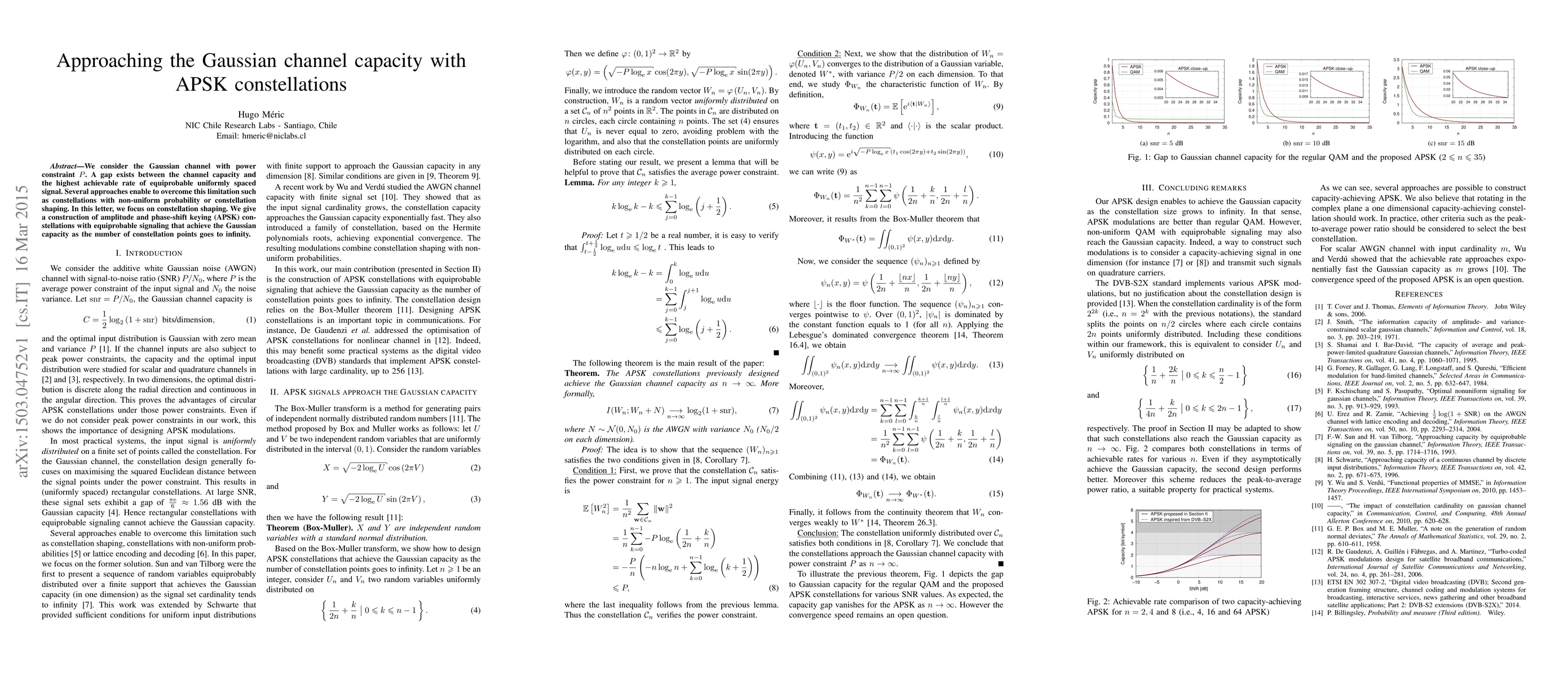 This paper explores the Gaussian channel capacity, demonstrating that APSK constellations with equiprobable signaling can approach the theoretical capacity as the number of points increases indefinitely, overcoming the gap between current achievable rates and the theoretical limit.