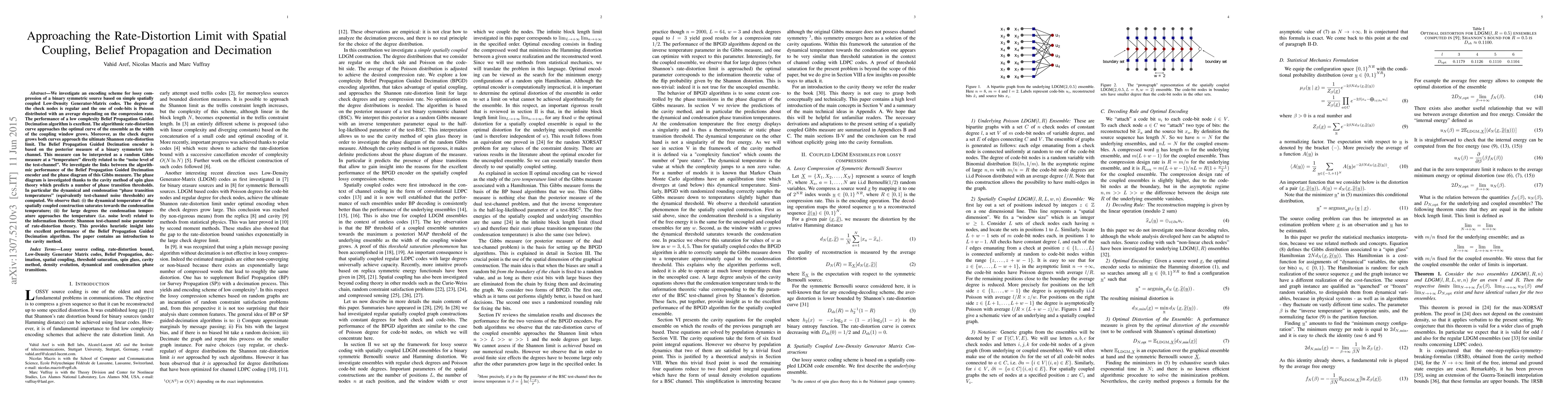 We investigate an encoding scheme for lossy compression of a binary symmetric source based on simple spatially coupled Low-Density Generator-Matrix codes. The degree of the check nodes is regular and the one of code-bits is Poisson distributed with an average depending on the compression rate. The performance of a low complexity Belief Propagation Guided Decimation algorithm is excellent. The algorithmic rate-distortion curve approaches the optimal curve of the ensemble as the width of the coupling window grows. Moreover, as the check degree grows both curves approach the ultimate Shannon rate-distortion limit. The Belief Propagation Guided Decimation encoder is based on the posterior measure of a binary symmetric test-channel. This measure can be interpreted as a random Gibbs measure at a "temperature" directly related to the "noise level of the test-channel". We investigate the links between the algorithmic performance of the Belief Propagation Guided Decimation encoder and the phase diagram of this Gibbs measure. The phase diagram is investigated thanks to the cavity method of spin glass theory which predicts a number of phase transition thresholds. In particular the dynamical and condensation "phase transition temperatures" (equivalently test-channel noise thresholds) are computed. We observe that: (i) the dynamical temperature of the spatially coupled construction saturates towards the condensation temperature; (ii) for large degrees the condensation temperature approaches the temperature (i.e. noise level) related to the information theoretic Shannon test-channel noise parameter of rate-distortion theory. This provides heuristic insight into the excellent performance of the Belief Propagation Guided Decimation algorithm. The paper contains an introduction to the cavity method.