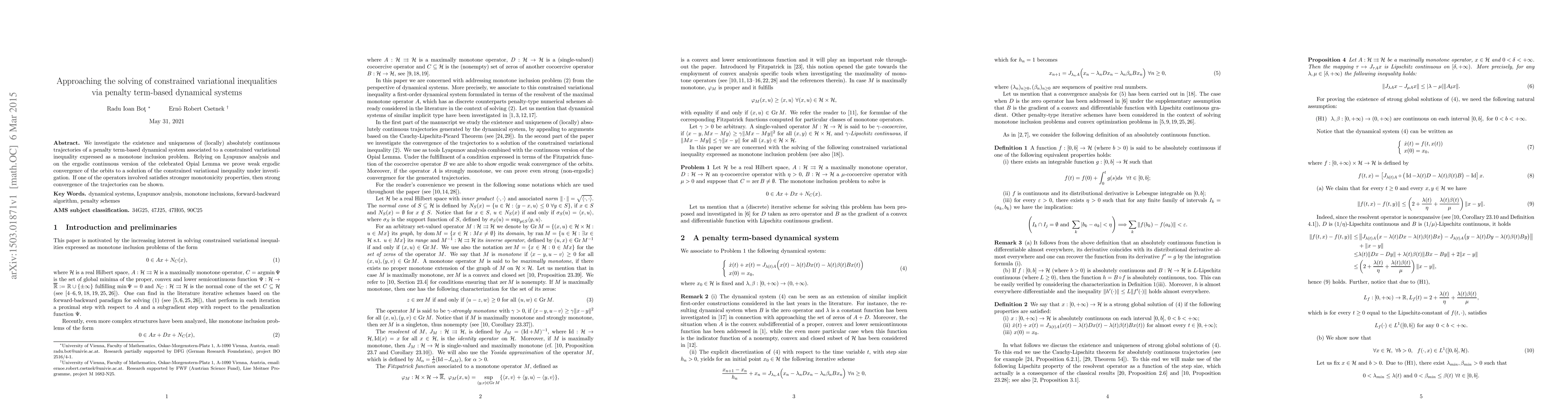 This paper explores the existence and uniqueness of trajectories in a penalty term-based dynamical system for solving constrained variational inequalities. It proves weak ergodic convergence to a solution under general conditions, and strong convergence if additional monotonicity properties are met.