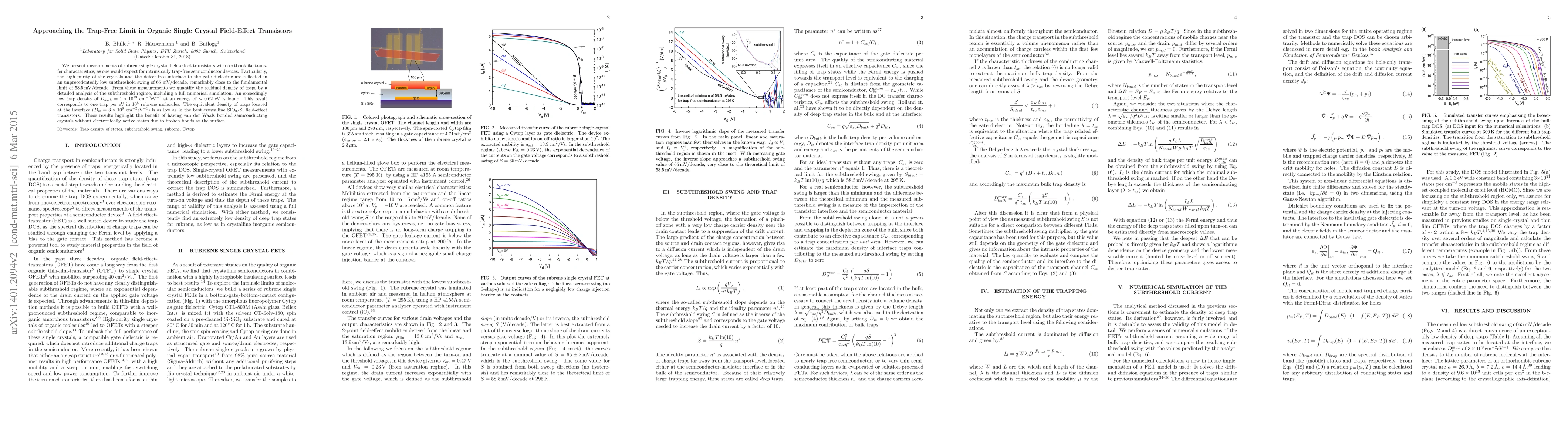 This paper investigates the trap-free performance of rubrene organic single crystal field-effect transistors, achieving a subthreshold swing of 65 mV/decade, nearly reaching the theoretical limit. The study reveals an exceptionally low trap density, with $D_{bulk} = 1 \times 10^{13}~{\rm cm^{-3}eV^{-1}}$ and $D_{it} = 3 \times 10^{9}~{\rm cm^{-2}eV^{-1}}$, comparable to the best inorganic semiconductors.