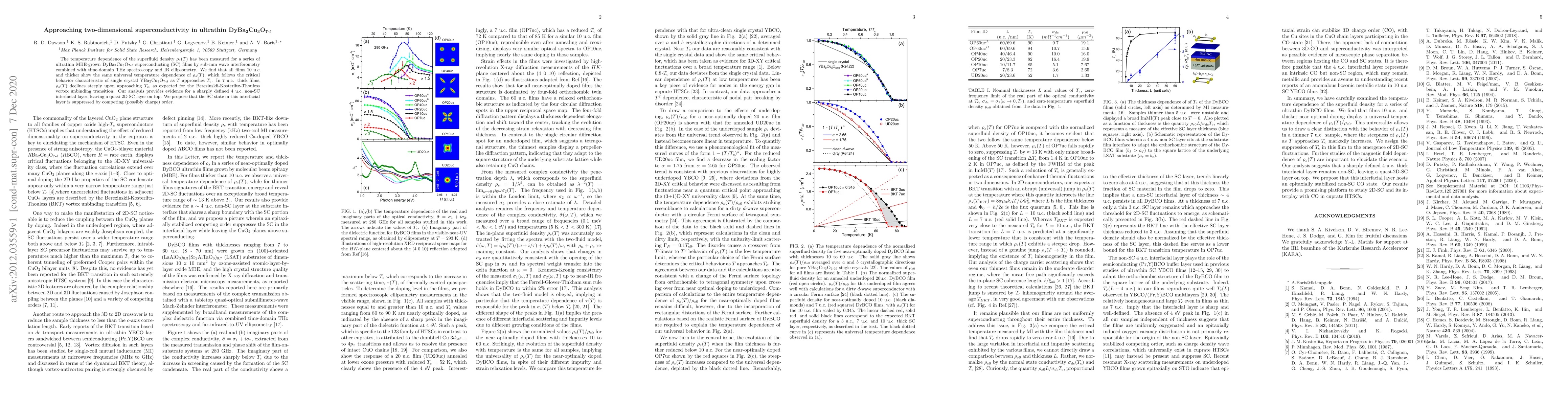 The temperature dependence of the superfluid density $\rho_s(T)$ has been measured for a series of ultrathin MBE-grown DyBa$_2$Cu$_3$O$_{7-\delta}$ superconducting (SC) films by sub-mm wave interferometry combined with time-domain THz spectroscopy and IR ellipsometry. We find that all films 10 u.c. and thicker show the same universal temperature dependence of $\rho_s(T)$, which follows the critical behavior characteristic of single crystal YBa$_2$Cu$_3$O$_{7-\delta}$ as $T$ approaches $T_c$. In 7 u.c. thick films, $\rho_s(T)$ declines steeply upon approaching $T_c$, as expected for the Berezinskii-Kosterlitz-Thouless vortex unbinding transition. Our analysis provides evidence for a sharply defined 4 u.c. non-SC interfacial layer, leaving a quasi-2D SC layer on top. We propose that the SC state in this interfacial layer is suppressed by competing (possibly charge) order.