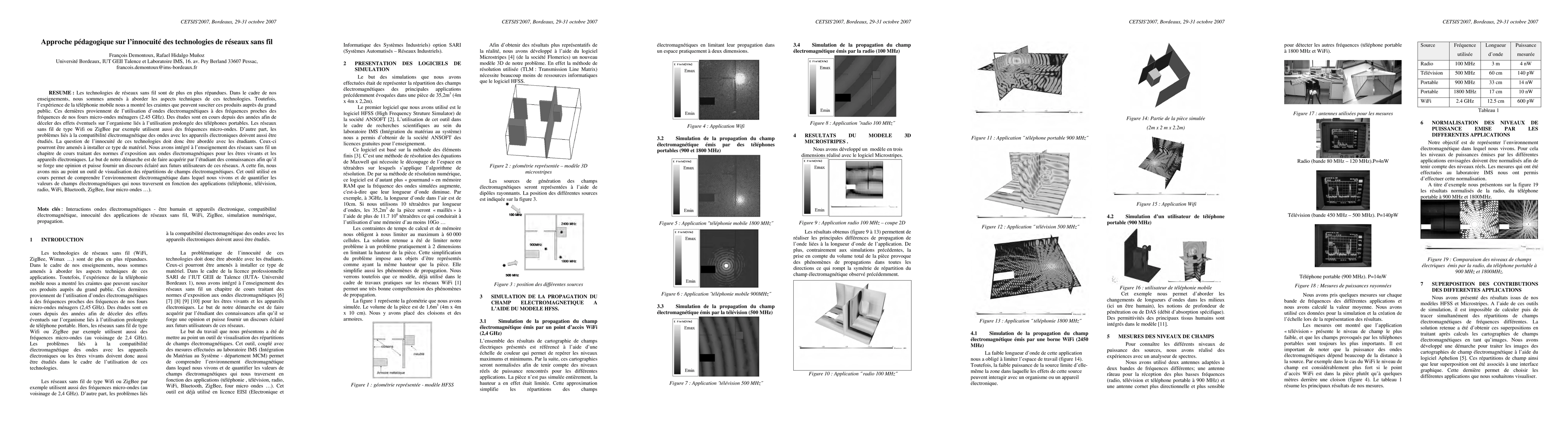 The wireless networks technologies are becoming more prevalent. As part of our courses, we have to deal with the technical aspects of these technologies. However, the experience of mobile telephony has shown fears that these products can lead to the general public. The latter comes from the use of electromagnetic waves at frequencies close to the frequencies of microwaves oven(2.45 GHz). Studies are under way for years in order to identify the possible effects on the body related to prolonged use of mobile phones. Wireless networks like WiFi or ZigBee for example works with microwave frequencies. On the other hand, problems relating to electromagnetic compatibility waves with the electronic devices must also be studied. The question of the safety of these technologies must be addressed with the students. They will may need to install such equipment. We have integrated the teaching of wireless networks in a chapter dealing with current standards of exposure to electromagnetic waves for living beings and the electronic devices. The aim of our approach is the obtention of knowledges by the student. so he will be able to form an opinion and to provide a speech enlightened to future users of these networks. To this end, we have developed a visualization tool for the distribution of electromagnetic fields. This tool being used will help you understand the electromagnetic environment in which we live and quantify the values of electromagnetic fields (telephony, television, radio, WiFi, Bluetooth, ZigBee, microwave oven, etc.).