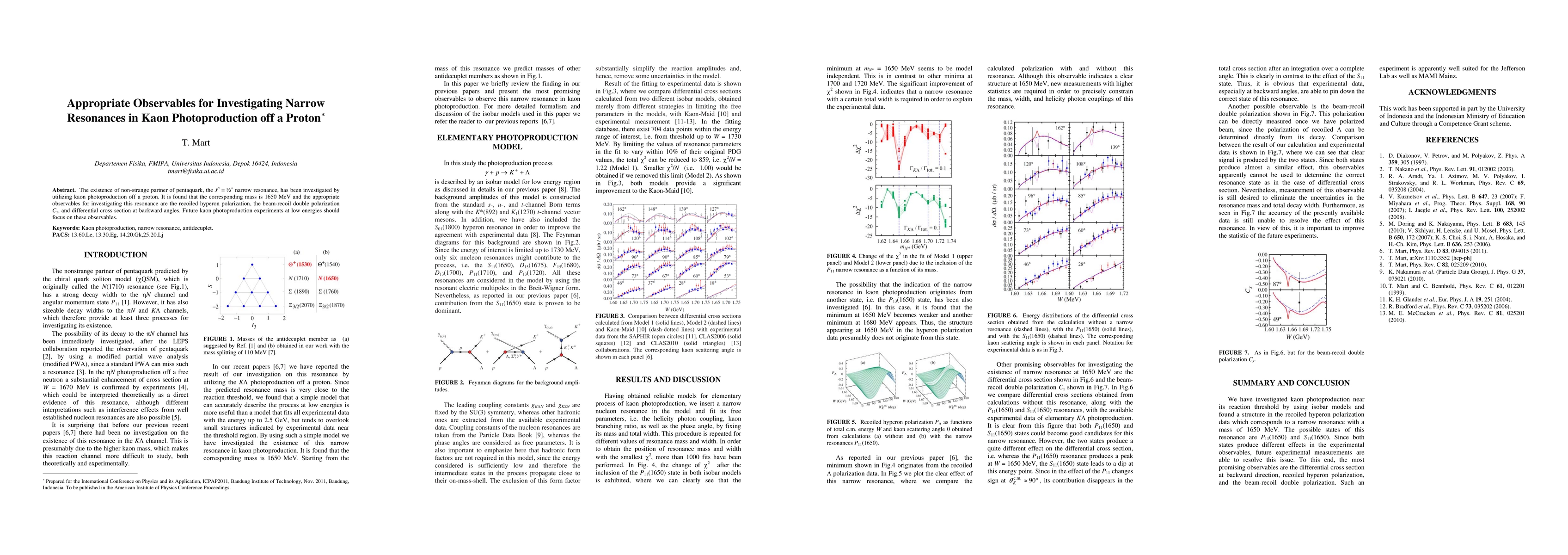 The existence of non-strange partner of pentaquark, the J^p = 1/2^+ narrow resonance, has been investigated by utilizing kaon photoproduction off a proton. It is found that the corresponding mass is 1650 MeV and the appropriate observables for investigating this resonance are the recoiled hyperon polarization, the beam-recoil double polarization C_x, and differential cross section at backward angles. Future kaon photoproduction experiments at low energies should focus on these observables.
