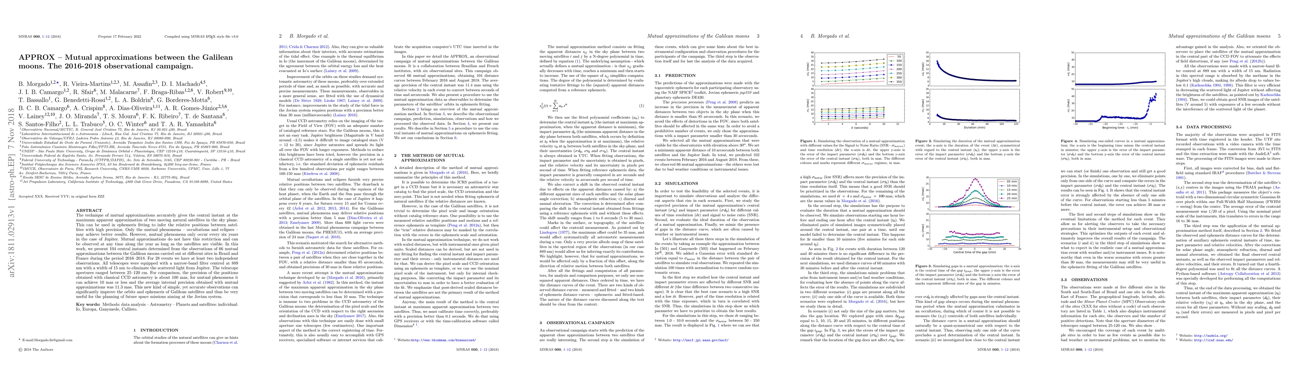The technique of mutual approximations accurately gives the central instant at the maximum apparent approximation of two moving natural satellites in the sky plane. This can be used in ephemeris fitting to infer the relative positions between satellites with high precision. Only the mutual phenomena -- occultations and eclipses -- may achieve better results. However, mutual phenomena only occur every six years in the case of Jupiter. Mutual approximations do not have this restriction and can be observed at any time along the year as long as the satellites are visible. In this work, we present 104 central instants determined from the observations of 66 mutual approximations between the Galilean moons carried out at different sites in Brazil and France during the period 2016--2018. For 28 events we have at least two independent observations. All telescopes were equipped with a narrow-band filter centred at 889 nm with a width of 15 nm to eliminate the scattered light from Jupiter. The telescope apertures ranged between 25--120 cm. For comparison, the precision of the positions obtained with classical CCD astrometry is about 100 mas, for mutual phenomena it can achieve 10 mas or less and the average internal precision obtained with mutual approximations was 11.3 mas. This new kind of simple, yet accurate observations can significantly improve the orbits and ephemeris of Galilean satellites and thus be very useful for the planning of future space missions aiming at the Jovian system.