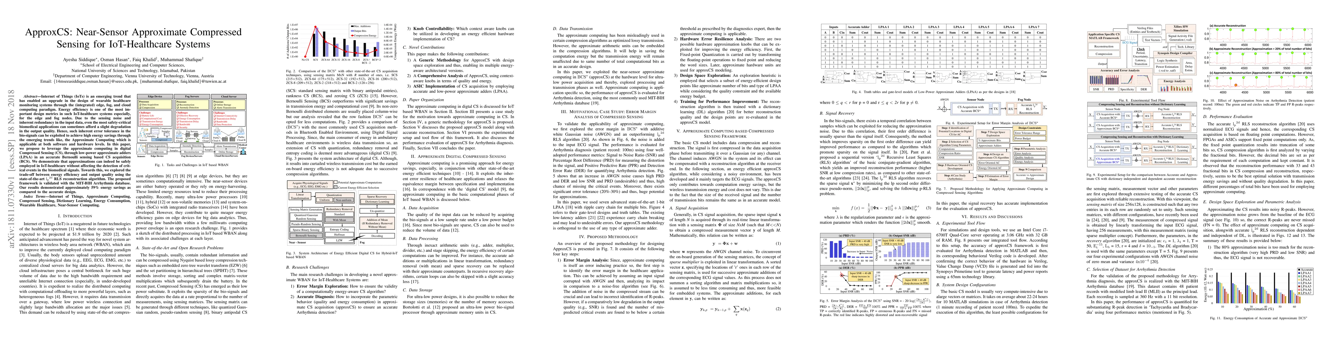 Internet of Things (IoTs) is an emerging trend that has enabled an upgrade in the design of wearable healthcare monitoring systems through the (integrated) edge, fog, and cloud computing paradigm. Energy efficiency is one of the most important design metrics in such IoT-healthcare systems especially, for the edge and fog nodes. Due to the sensing noise and inherent redundancy in the input data, even the most safety-critical biomedical applications can sometimes afford a slight degradation in the output quality. Hence, such inherent error tolerance in the bio-signals can be exploited to achieve high energy savings through the emerging trends like, the Approximate Computing which is applicable at both software and hardware levels. In this paper, we propose to leverage the approximate computing in digital Compressed Sensing (CS), through low-power approximate adders (LPAA) in an accurate Bernoulli sensing-based CS acquisition (BCS). We demonstrate that approximations can indeed be safely employed in IoT healthcare without affecting the detection of critical events in the biomedical signals. Towards this, we explored the trade-of between energy efficiency and output quality using the state-of-the-art lp2d RLS reconstruction algorithm. The proposed framework is validated with the MIT-BIH Arrhythmia database. Our results demonstrated approximately 59% energy savings as compared to the accurate design.