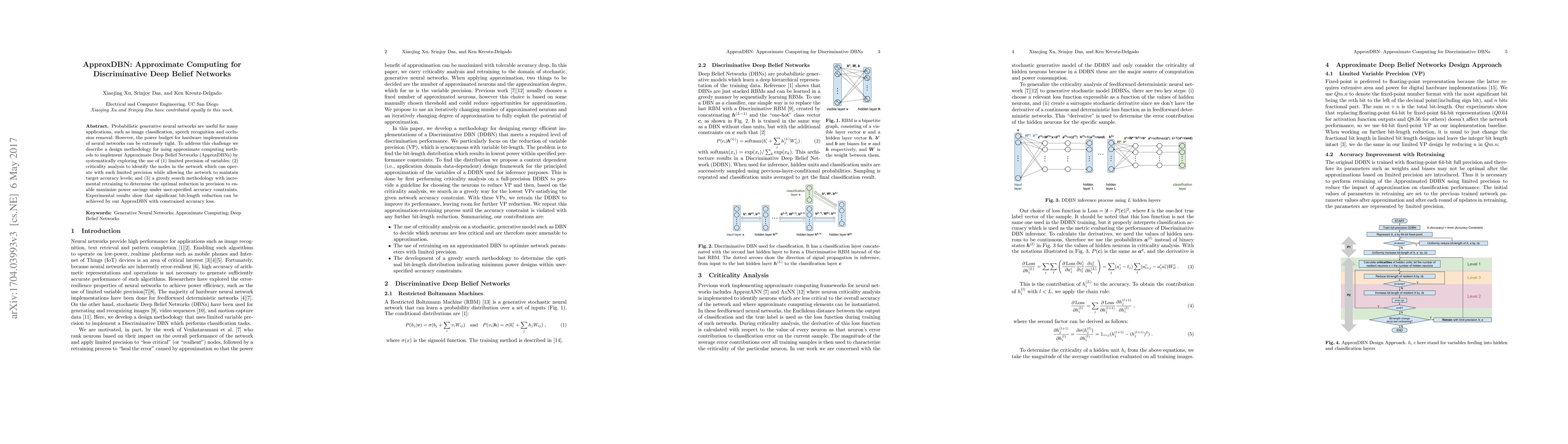 Probabilistic generative neural networks are useful for many applications, such as image classification, speech recognition and occlusion removal. However, the power budget for hardware implementations of neural networks can be extremely tight. To address this challenge we describe a design methodology for using approximate computing methods to implement Approximate Deep Belief Networks (ApproxDBNs) by systematically exploring the use of (1) limited precision of variables; (2) criticality analysis to identify the nodes in the network which can operate with such limited precision while allowing the network to maintain target accuracy levels; and (3) a greedy search methodology with incremental retraining to determine the optimal reduction in precision to enable maximize power savings under user-specified accuracy constraints. Experimental results show that significant bit-length reduction can be achieved by our ApproxDBN with constrained accuracy loss.