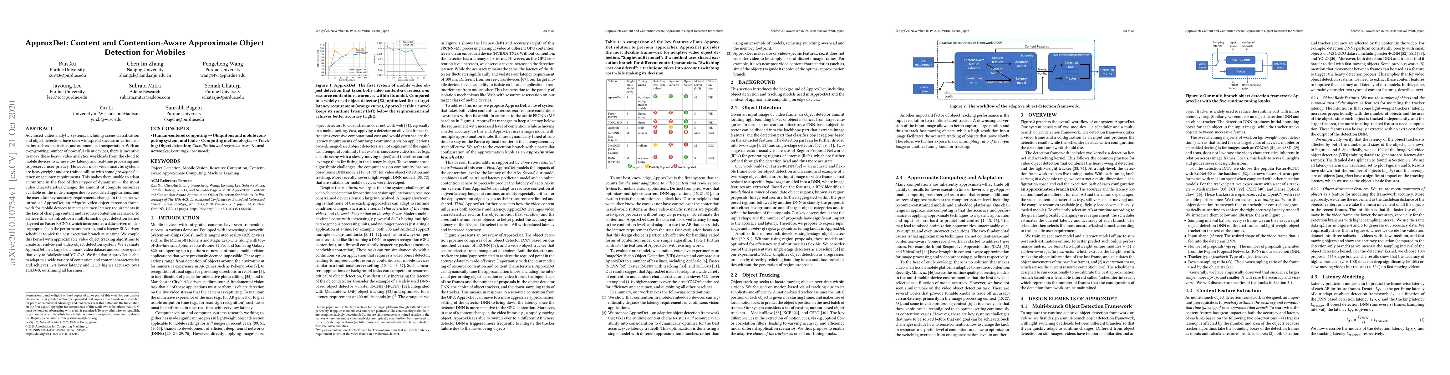 This research introduces ApproxDet, an adaptive framework for mobile devices to perform object detection in real-time, addressing dynamic content and resource contention. The system leverages a multi-branch object detection kernel based on Faster R-CNN and an adaptive scheduler to optimize performance based on changing conditions and user requirements. Evaluations show that ApproxDet significantly reduces latency and improves accuracy compared to existing methods.
