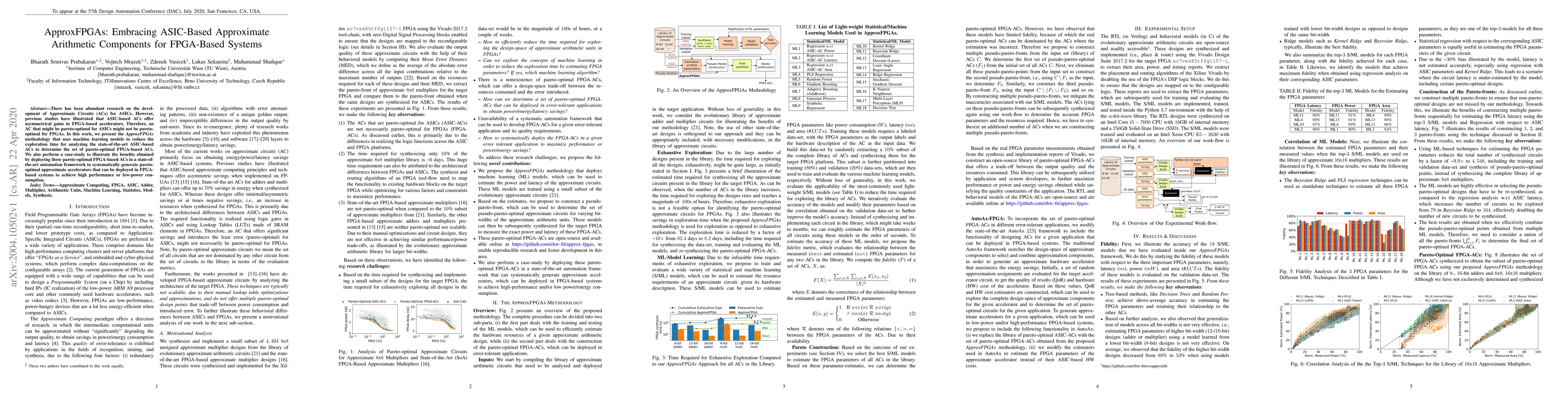 This paper introduces ApproxFPGAs, a methodology leveraging machine learning to identify pareto-optimal approximate arithmetic components for FPGA-based systems, contrasting with traditional ASIC-based ACs. The study demonstrates the benefits of these components in generating high-performance or low-power FPGA accelerators.