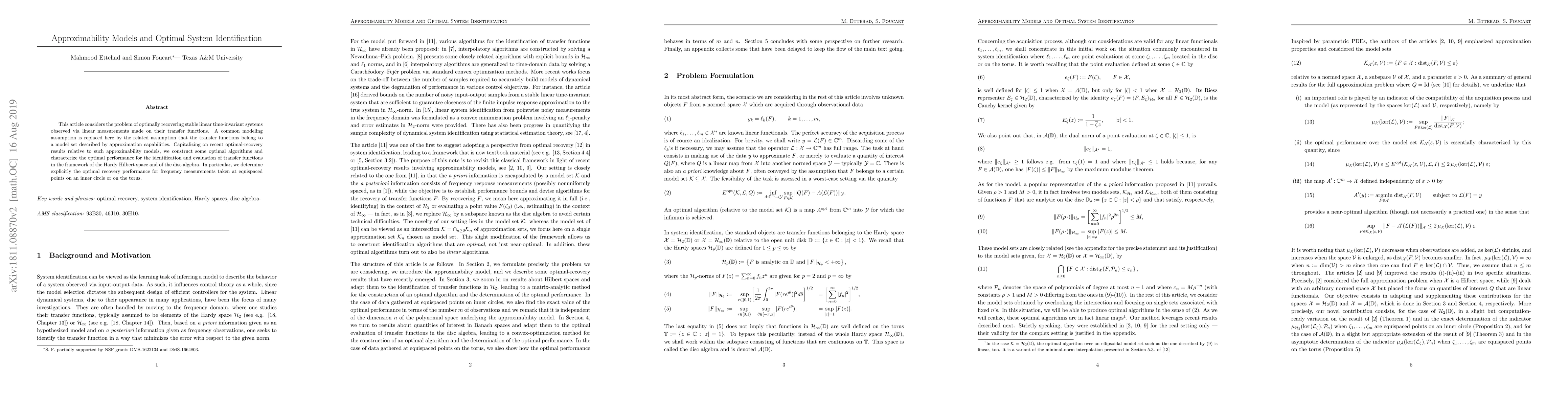 This article considers the problem of optimally recovering stable linear time-invariant systems observed via linear measurements made on their transfer functions. A common modeling assumption is replaced here by the related assumption that the transfer functions belong to a model set described by approximation capabilities. Capitalizing on recent optimal-recovery results relative to such approximability models, we construct some optimal algorithms and characterize the optimal performance for the identification and evaluation of transfer functions in the framework of the Hardy Hilbert space and of the disc algebra. In particular, we determine explicitly the optimal recovery performance for frequency measurements taken at equispaced points on an inner circle or on the torus.