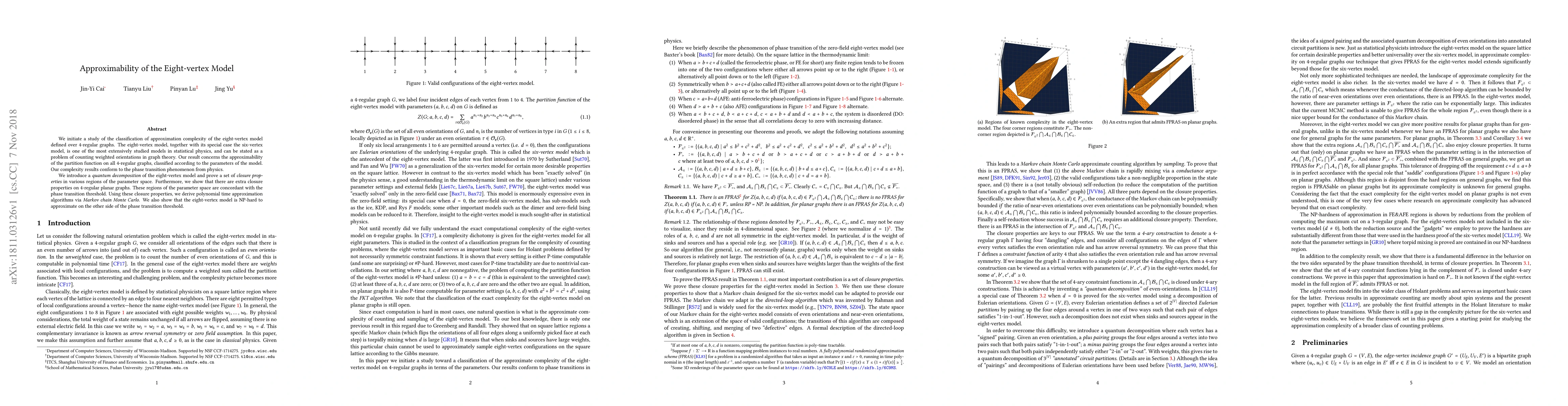 This paper explores the approximation complexity of the eight-vertex model on 4-regular graphs, revealing a phase transition phenomenon. It introduces quantum decompositions and closure properties, leading to polynomial time approximation algorithms for regions below the threshold, while proving NP-hardness for regions above.