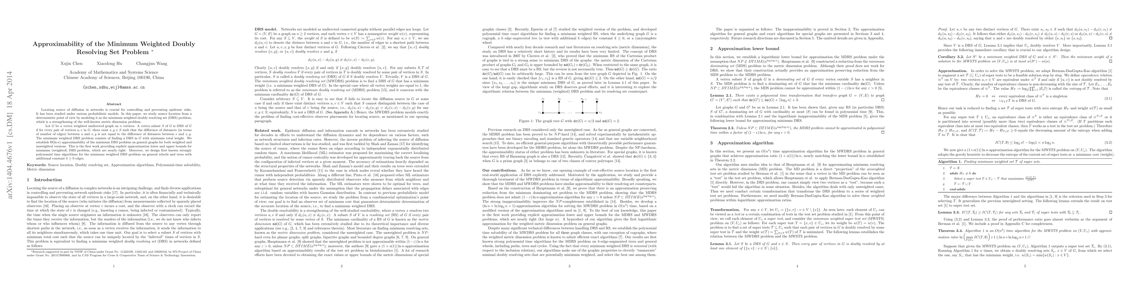 Locating source of diffusion in networks is crucial for controlling and preventing epidemic risks. It has been studied under various probabilistic models. In this paper, we study source location from a deterministic point of view by modeling it as the minimum weighted doubly resolving set (DRS) problem, which is a strengthening of the well-known metric dimension problem. Let $G$ be a vertex weighted undirected graph on $n$ vertices. A vertex subset $S$ of $G$ is DRS of $G$ if for every pair of vertices $u,v$ in $G$, there exist $x,y\in S$ such that the difference of distances (in terms of number of edges) between $u$ and $x,y$ is not equal to the difference of distances between $v$ and $x,y$. The minimum weighted DRS problem consists of finding a DRS in $G$ with minimum total weight. We establish $\Theta(\ln n)$ approximability of the minimum DRS problem on general graphs for both weighted and unweighted versions. This is the first work providing explicit approximation lower and upper bounds for minimum (weighted) DRS problem, which are nearly tight. Moreover, we design first known strongly polynomial time algorithms for the minimum weighted DRS problem on general wheels and trees with additional constant $k\ge0$ edges.