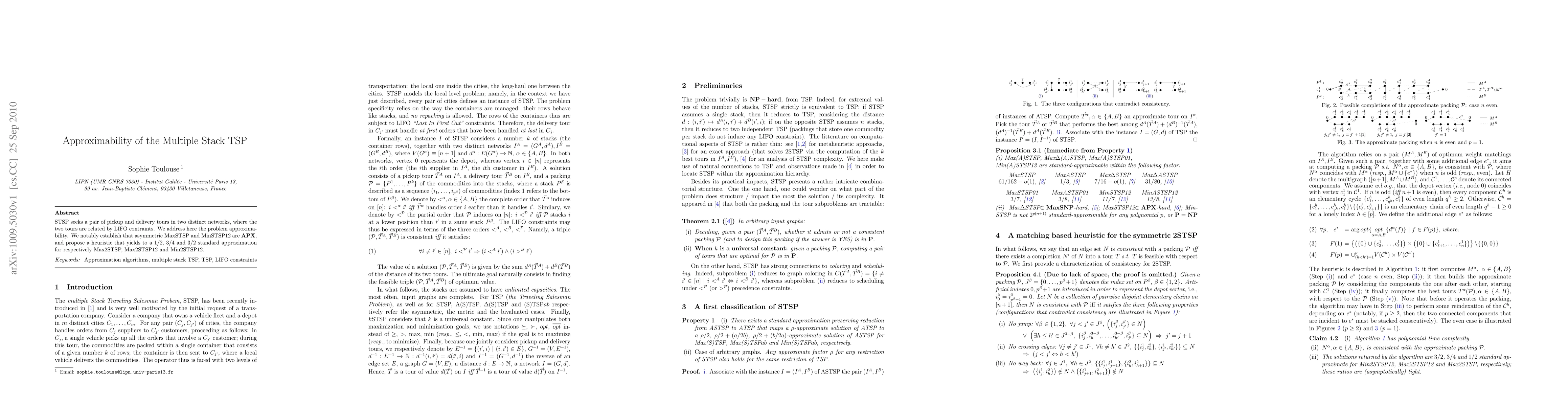 Researchers investigated approximability of a variant of the Traveling Salesman Problem (TSP) involving multiple stacks and established that certain versions are approximately polynomial time solvable (APX), while proposing a heuristic for approximation.