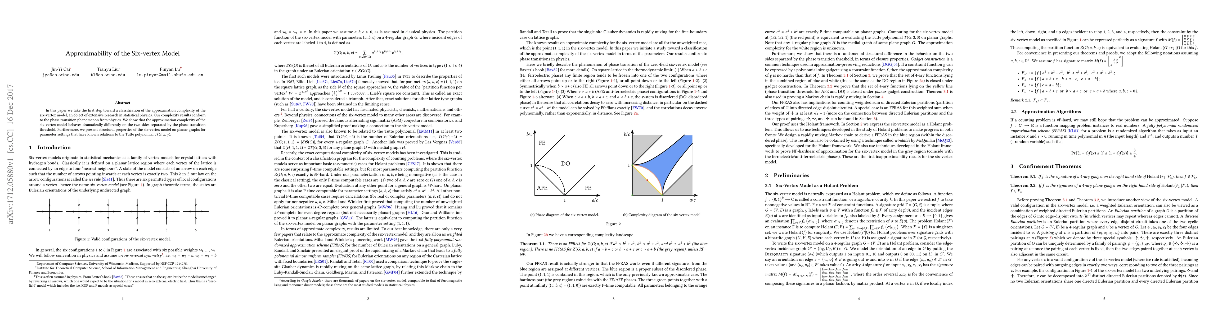 This paper classifies the approximation complexity of the six-vertex model, revealing significant differences in complexity across the phase transition threshold. It also explores structural properties related to the Tutte polynomial on planar graphs.