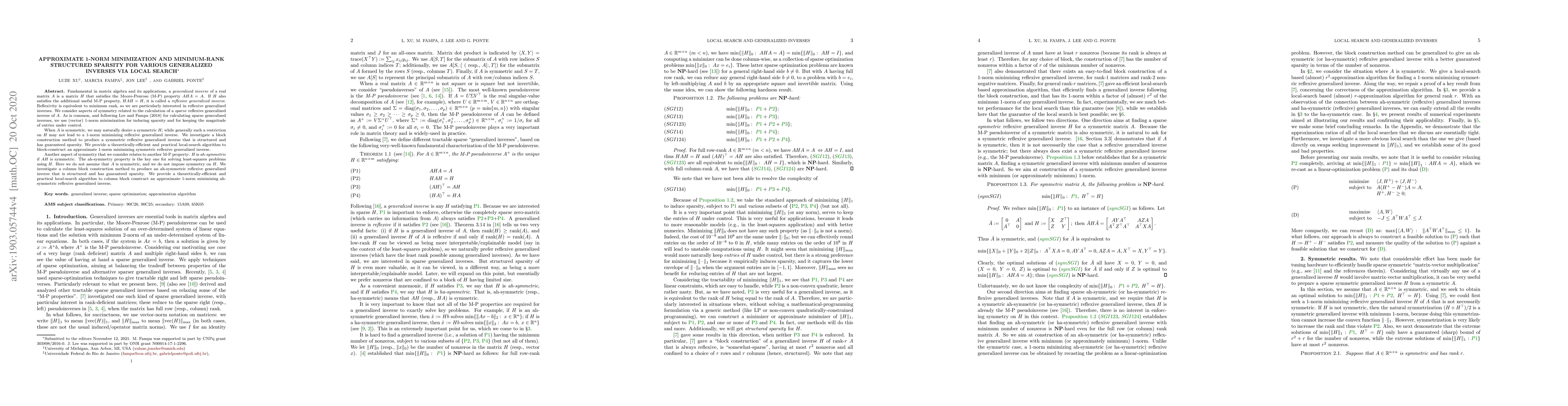 Fundamental in matrix algebra and its applications, a \emph{generalized inverse} of a real matrix $A$ is a matrix $H$ that satisfies the Moore-Penrose (M-P) property $AHA=A$. If $H$ also satisfies the additional useful M-P property, $HAH=H$, it is called a \emph{reflexive generalized inverse}. Reflexivity is equivalent to minimum rank, so we are particularly interested in reflexive generalized inverses. We consider aspects of symmetry related to the calculation of a \emph{sparse} reflexive generalized inverse of $A$. As is common, and following Lee and Fampa (2018) for calculating sparse generalized inverses, we use (vector) 1-norm minimization for inducing sparsity and for keeping the magnitude of entries under control. When $A$ is symmetric, we may naturally desire a symmetric $H$; while generally such a restriction on $H$ may not lead to a 1-norm minimizing reflexive generalized inverse. We investigate a block construction method to produce a symmetric reflexive generalized inverse that is structured and has guaranteed sparsity. We provide a theoretically-efficient and practical local-search algorithm to block-construct an approximate 1-norm minimizing symmetric reflexive generalized inverse. Another aspect of symmetry that we consider relates to another M-P property: $H$ is \emph{ah-symmetric} if $AH$ is symmetric. The ah-symmetry property is the key one for solving least-squares problems using $H$. Here we do not assume that $A$ is symmetric, and we do not impose symmetry on $H$. We investigate a column block construction method to produce an ah-symmetric reflexive generalized inverse that is structured and has guaranteed sparsity. We provide a theoretically-efficient and practical local-search algorithm to column block construct an approximate 1-norm minimizing ah-symmetric reflexive generalized inverse.