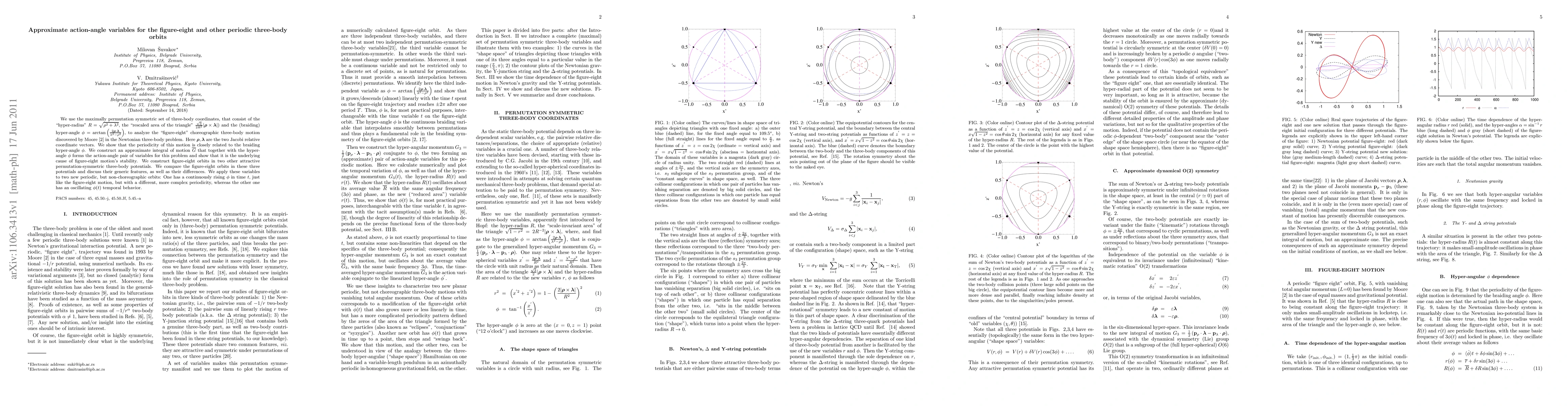 We use the maximally permutation symmetric set of three-body coordinates, that consist of the "hyper-radius" $R = \sqrt{\rho^{2} + \lambda^{2}}$, the "rescaled area of the triangle" $\frac{\sqrt 3}{2 R^2} |{\bm \rho} \times {\bm \lambda}|$) and the (braiding) hyper-angle $\phi = \arctan(\frac{2{\bm \rho} \cdot {\bm \lambda}}{\lambda^2 - \rho^2})$, to analyze the "figure-eight" choreographic three-body motion discovered by Moore \cite{Moore1993} in the Newtonian three-body problem. Here ${\bm \rho}, {\bm \lambda}$ are the two Jacobi relative coordinate vectors. We show that the periodicity of this motion is closely related to the braiding hyper-angle $\phi$. We construct an approximate integral of motion ${\bar{G}}$ that together with the hyper-angle $\phi$ forms the action-angle pair of variables for this problem and show that it is the underlying cause of figure-eight motion's stability. We construct figure-eight orbits in two other attractive permutation-symmetric three-body potentials. We compare the figure-eight orbits in these three potentials and discuss their generic features, as well as their differences. We apply these variables to two new periodic, but non-choreographic orbits: One has a continuously rising $\phi$ in time $t$, just like the figure-eight motion, but with a different, more complex periodicity, whereas the other one has an oscillating $\phi(t)$ temporal behavior.