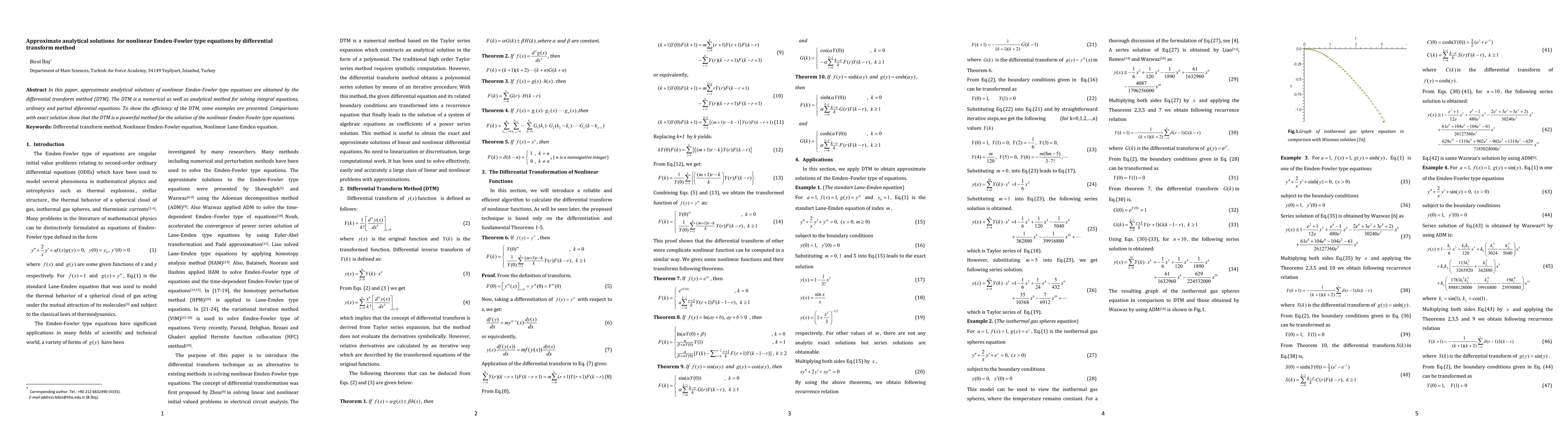 This paper presents approximate analytical solutions for nonlinear Emden-Fowler type equations using the differential transform method (DTM). The DTM is shown to be effective through comparisons with exact solutions, demonstrating its power in solving such nonlinear equations.