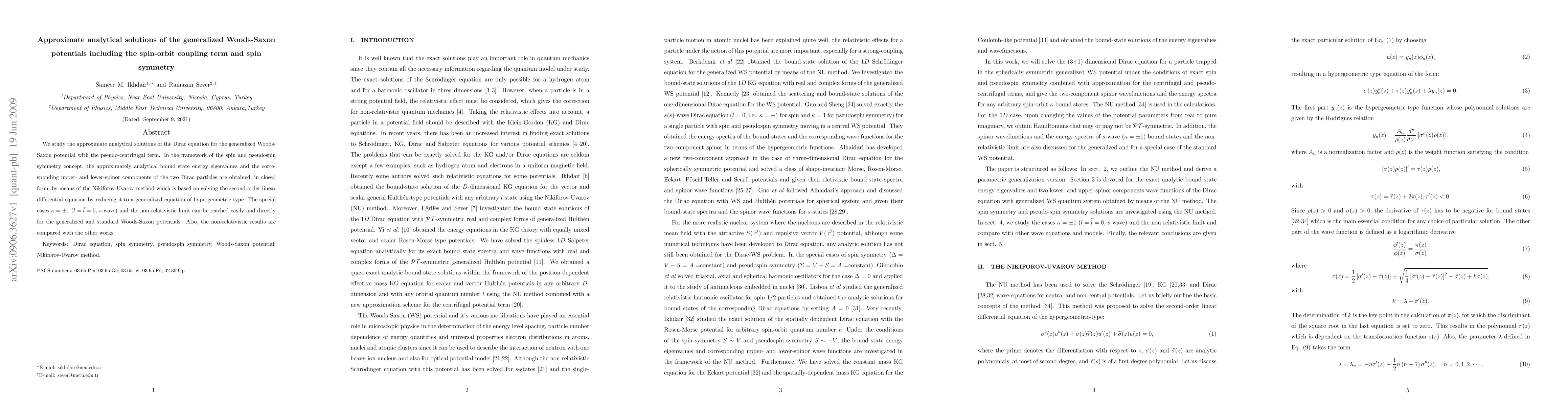 This paper presents approximate analytical solutions for the Dirac equation under generalized Woods-Saxon potentials, incorporating spin-orbit coupling and spin symmetry. The Nikiforov-Uvarov method is used to derive closed-form expressions for bound state energies and spinor components.