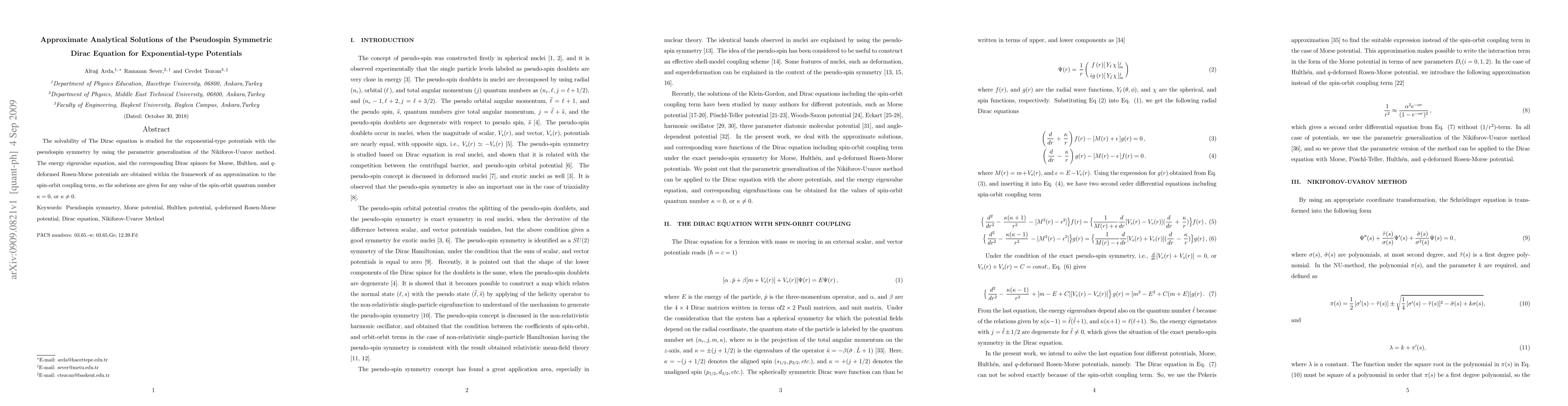 This paper explores the Dirac equation for exponential-type potentials exhibiting pseudospin symmetry, employing a parametric generalization of the Nikiforov-Uvarov method. Analytical solutions for energy eigenvalues and corresponding Dirac spinors are derived for Morse, Hulthen, and q-deformed Rosen-Morse potentials, valid for any spin-orbit quantum number.