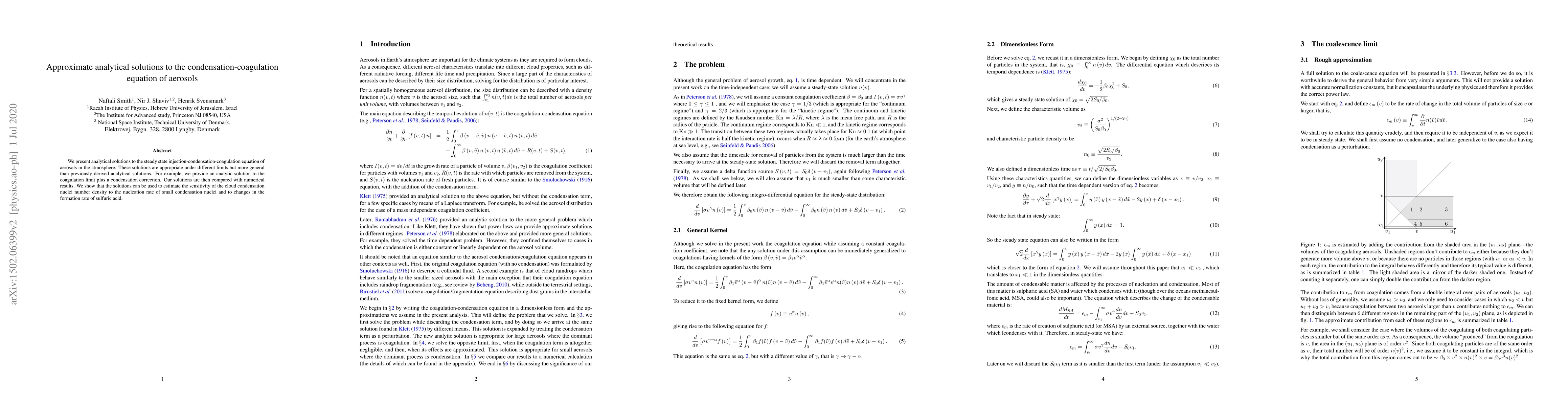 We present analytical solutions to the steady state injection-condensation-coagulation equation of aerosols in the atmosphere. These solutions are appropriate under different limits but more general than previously derived analytical solutions. For example, we provide an analytic solution to the coagulation limit plus a condensation correction. Our solutions are then compared with numerical results. We show that the solutions can be used to estimate the sensitivity of the cloud condensation nuclei number density to the nucleation rate of small condensation nuclei and to changes in the formation rate of sulfuric acid.