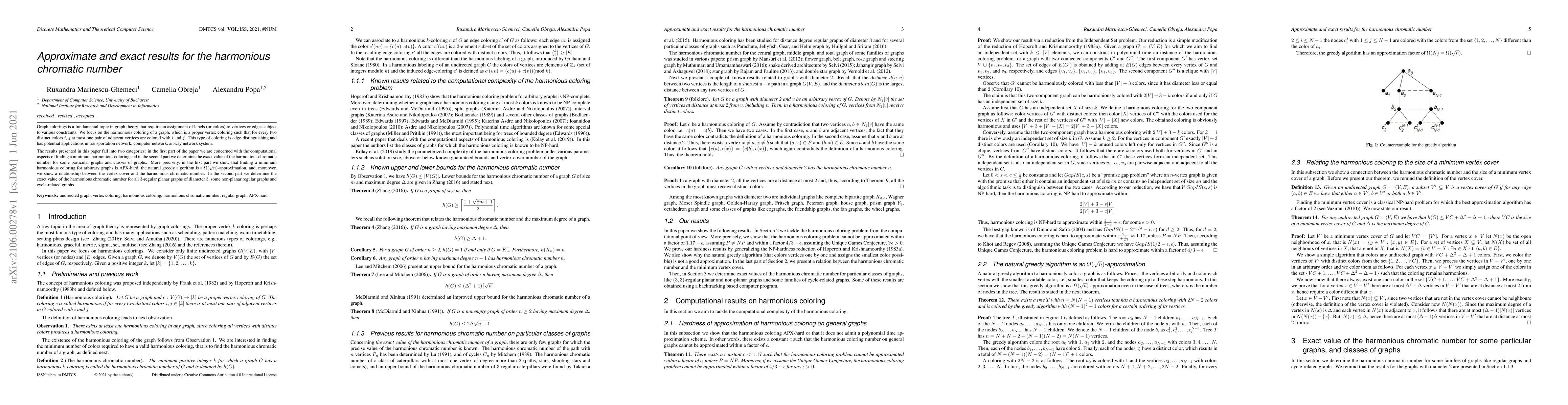 This paper investigates the harmonious chromatic number, a proper vertex coloring where adjacent vertices have at most one pair sharing a color. It proves the APX-hardness of finding a minimum harmonious coloring and provides an approximation algorithm. It also determines the exact harmonious chromatic number for specific graph classes including 3-regular planar graphs and cycle-related graphs.