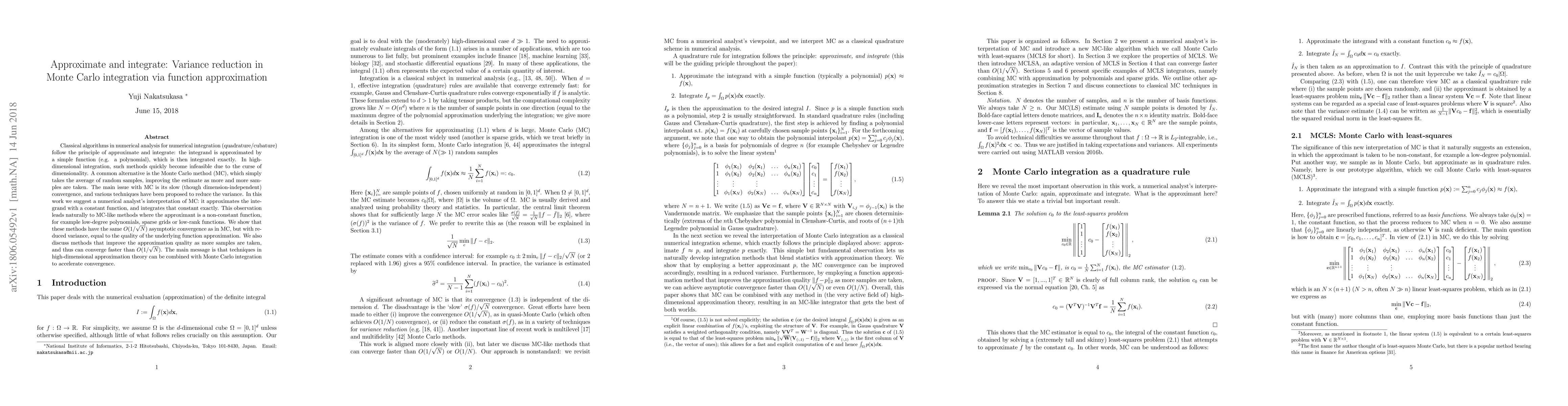 This paper proposes combining Monte Carlo integration with function approximation techniques to reduce variance and improve convergence rates. It suggests using non-constant approximants like low-degree polynomials, sparse grids, or low-rank functions to achieve $O(1/\sqrt{N})$ convergence with reduced variance, leveraging high-dimensional approximation theory to enhance the efficiency of Monte Carlo methods.