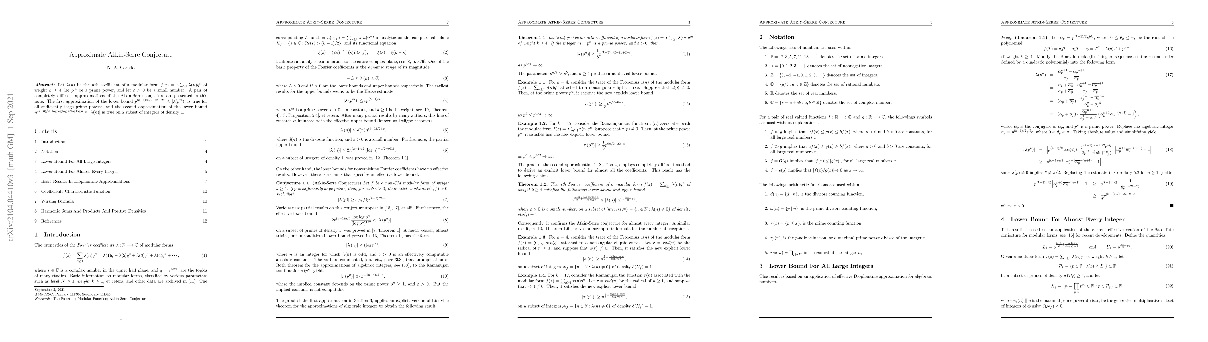 Let $\lambda(m)$ be the $m$th coefficient of a modular form $f(z)=\sum_{m\geq 1} \lambda(m)q^m$ of weight $k\geq 4$, let $p^n$ be a prime power, and let $\varepsilon>0$ be a small number. An approximate of the Atkin-Serre conjecture on the lower bound of the form $\left |\lambda\left (p^n\right )\right | \geq p^{(k-1)n/2-2k+2\varepsilon}$ is presented in this note.