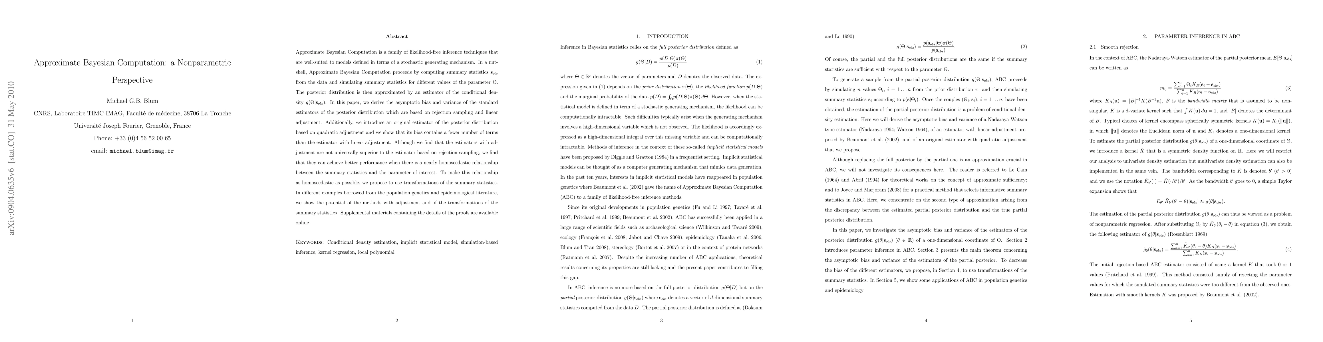 This paper investigates the asymptotic properties of estimators in Approximate Bayesian Computation (ABC) and proposes new estimators based on quadratic adjustment, showing they can reduce bias compared to linear adjustment. The study finds that these adjusted estimators perform better under nearly homoscedastic relationships between summary statistics and parameters, suggesting transformations of summary statistics can enhance performance.
