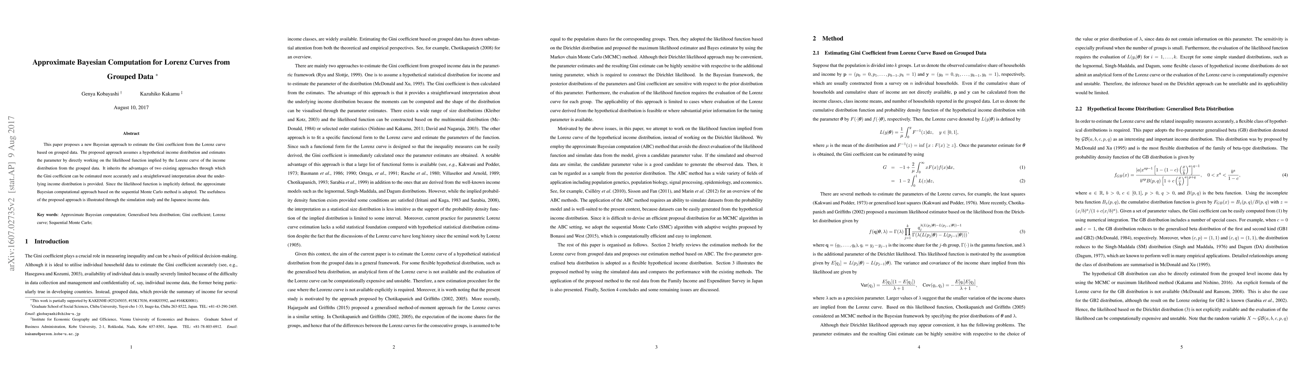 This paper proposes a new Bayesian approach to estimate the Gini coefficient from the Lorenz curve based on grouped data. The proposed approach assumes a hypothetical income distribution and estimates the parameter by directly working on the likelihood function implied by the Lorenz curve of the income distribution from the grouped data. It inherits the advantages of two existing approaches through which the Gini coefficient can be estimated more accurately and a straightforward interpretation about the underlying income distribution is provided. Since the likelihood function is implicitly defined, the approximate Bayesian computational approach based on the sequential Monte Carlo method is adopted. The usefulness of the proposed approach is illustrated through the simulation study and the Japanese income data.