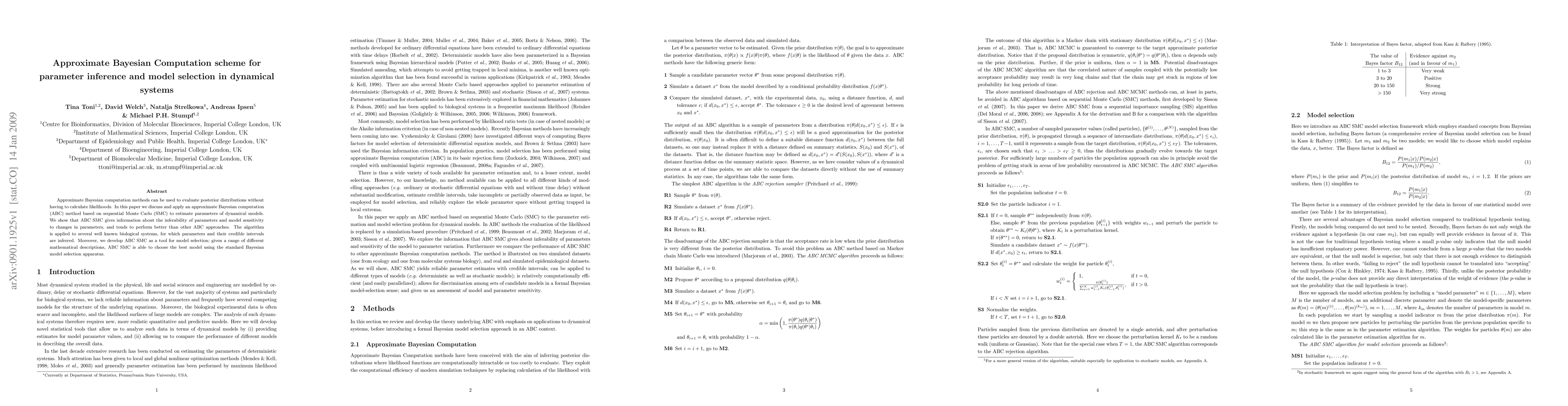 This paper introduces an approximate Bayesian computation (ABC) method based on sequential Monte Carlo (SMC) for parameter inference and model selection in dynamical systems. The proposed ABC SMC method outperforms other ABC approaches and is applied to infer parameters and select the best model in several biological systems.