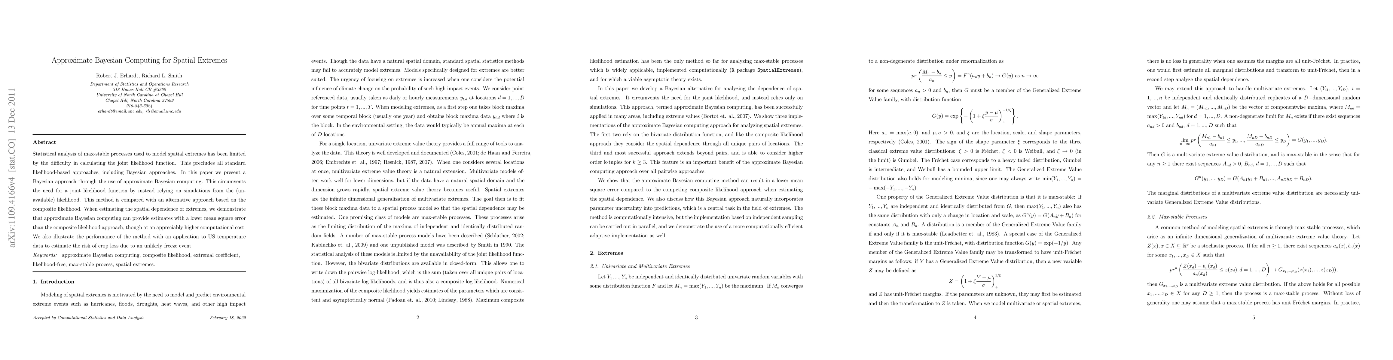This paper introduces an approximate Bayesian computing method to model spatial extremes, bypassing the need for a joint likelihood function. It demonstrates superior performance in estimating spatial dependence compared to the composite likelihood approach, albeit with higher computational costs, and applies it to US temperature data to assess crop loss risk from extreme cold events.