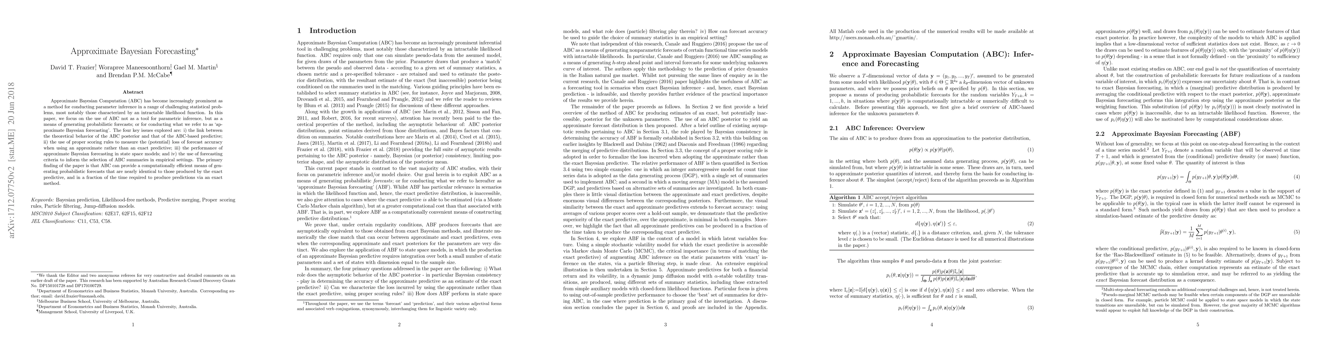 This paper introduces Approximate Bayesian Forecasting, a method that uses Approximate Bayesian Computation to generate probabilistic forecasts efficiently. It finds that ABC-based forecasts can be nearly identical to exact predictions in a fraction of the time.