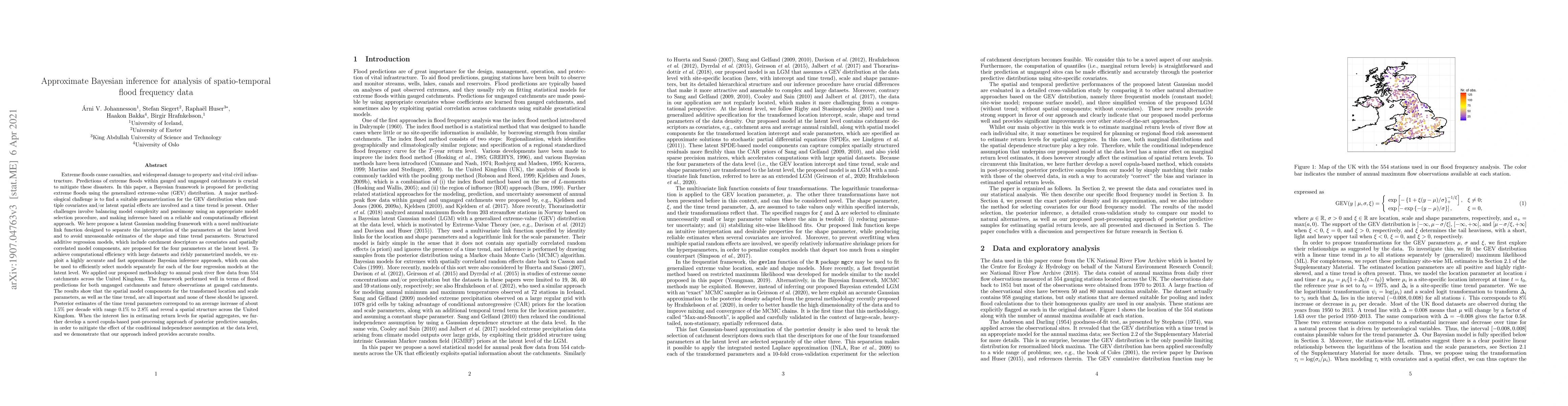 This paper proposes a Bayesian approach using the generalized extreme-value distribution to predict extreme floods, addressing challenges in model parametrization and complexity. The methodology employs a latent Gaussian model with a novel multivariate link function and structured additive regression, achieving accurate flood predictions across 554 UK catchments.
