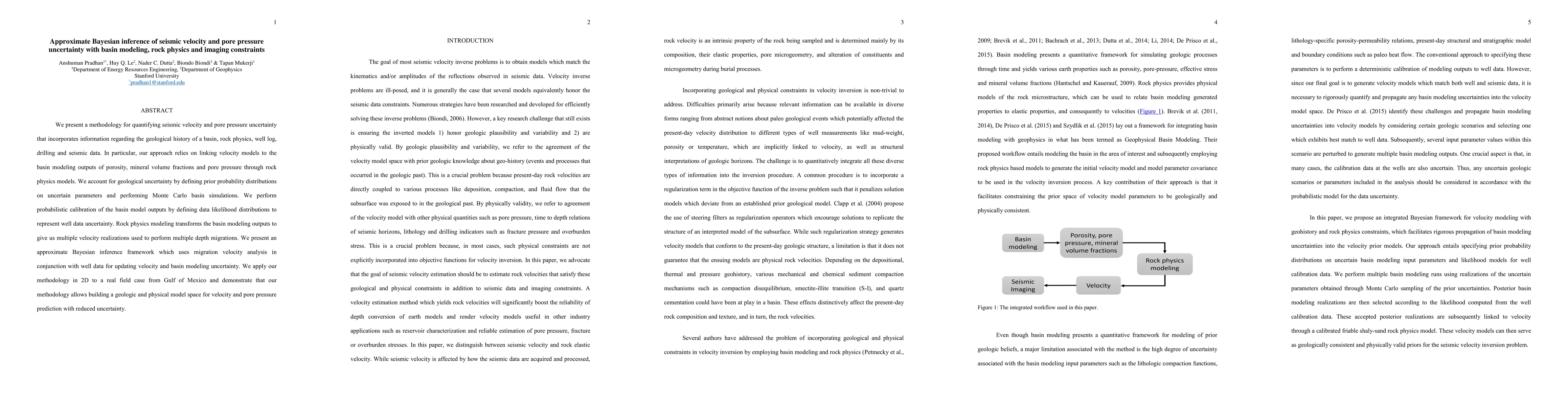 This paper proposes a Bayesian inference methodology for quantifying seismic velocity and pore pressure uncertainties, integrating basin modeling, rock physics, and imaging constraints. The approach uses Monte Carlo simulations and probabilistic calibration to update geological and physical models, ultimately reducing uncertainty in predictions for a real field case in the Gulf of Mexico.