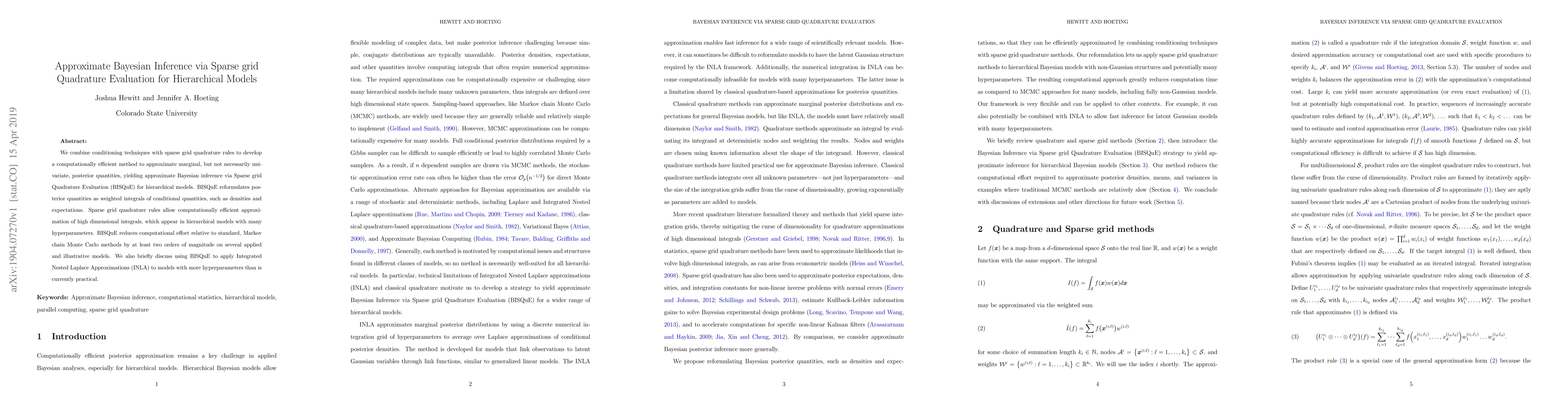 This paper introduces BISQuE, a novel method for approximate Bayesian inference in hierarchical models, combining conditioning techniques with sparse grid quadrature to efficiently approximate posterior quantities. BISQuE reformulates posterior integrals as weighted conditional integrals, significantly reducing computational effort compared to MCMC methods.
