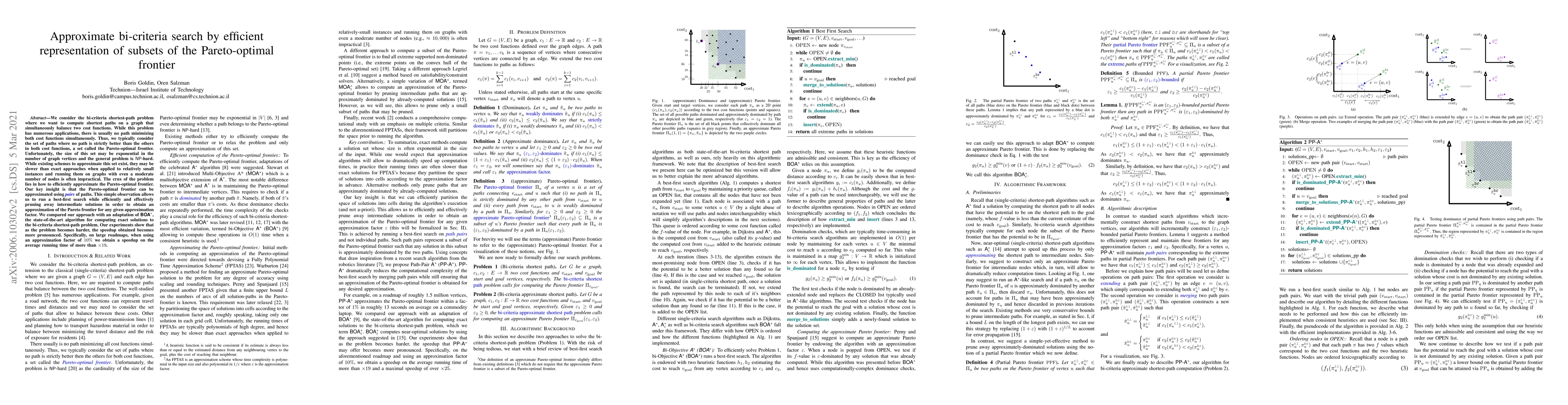 We consider the bi-criteria shortest-path problem where we want to compute shortest paths on a graph that simultaneously balance two cost functions. While this problem has numerous applications, there is usually no path minimizing both cost functions simultaneously. Thus, we typically consider the set of paths where no path is strictly better then the others in both cost functions, a set called the Pareto-optimal frontier. Unfortunately, the size of this set may be exponential in the number of graph vertices and the general problem is NP-hard. While existing schemes to approximate this set exist, they may be slower than exact approaches when applied to relatively small instances and running them on graphs with even a moderate number of nodes is often impractical. The crux of the problem lies in how to efficiently approximate the Pareto-optimal frontier. Our key insight is that the Pareto-optimal frontier can be approximated using pairs of paths. This simple observation allows us to run a best-first-search while efficiently and effectively pruning away intermediate solutions in order to obtain an approximation of the Pareto frontier for any given approximation factor. We compared our approach with an adaptation of BOA*, the state-of-the-art algorithm for computing exact solutions to the bi-criteria shortest-path problem. Our experiments show that as the problem becomes harder, the speedup obtained becomes more pronounced. Specifically, on large roadmaps, we obtain an average speedup of more than $\times 8.5$ and a maximal speedup of over $\times 148$.