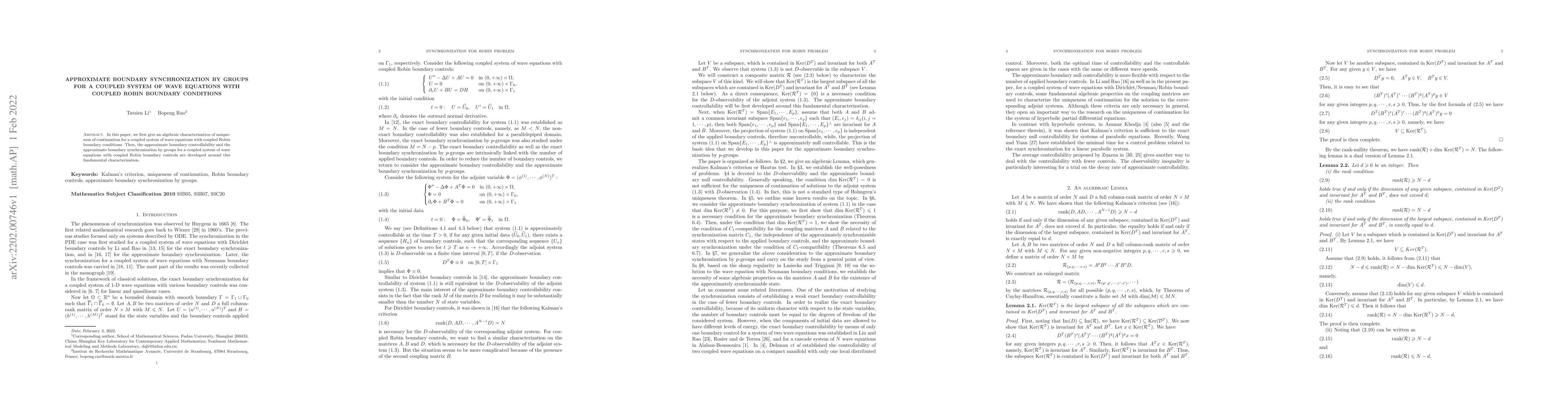 This paper provides an algebraic characterization of uniqueness for a coupled system of wave equations with Robin boundary conditions and develops approximate boundary controllability and synchronization by groups for such systems.
